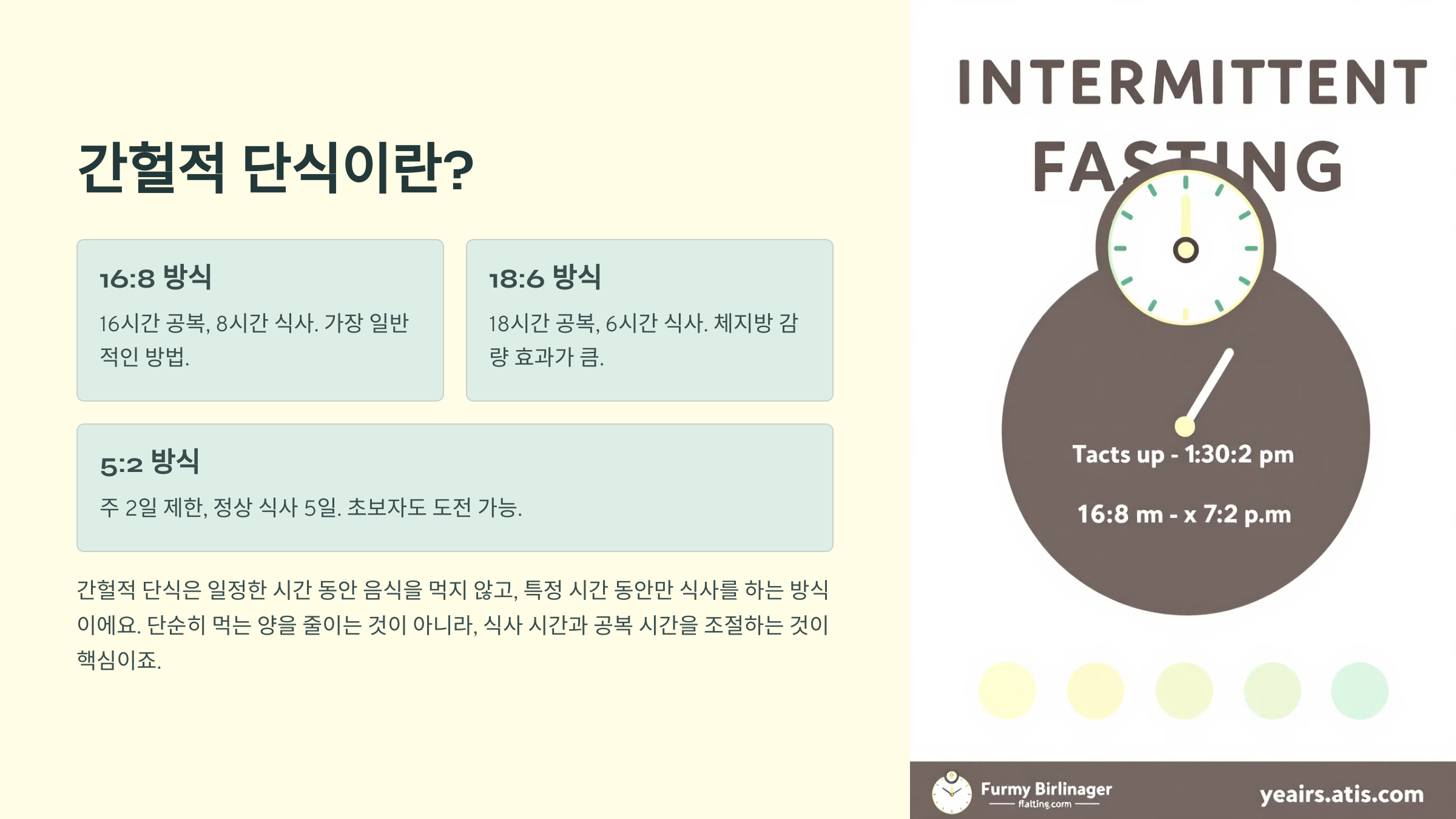 특히 처음 시작할 때는 12:12 방식(공복 12시간, 식사 12시간)으로 시작한 뒤, 점차 16:8 또는 18:6 방식으로 늘려가는 것이 좋아요. 이렇게 하면 몸이 자연스럽게 적응할 수 있어요.