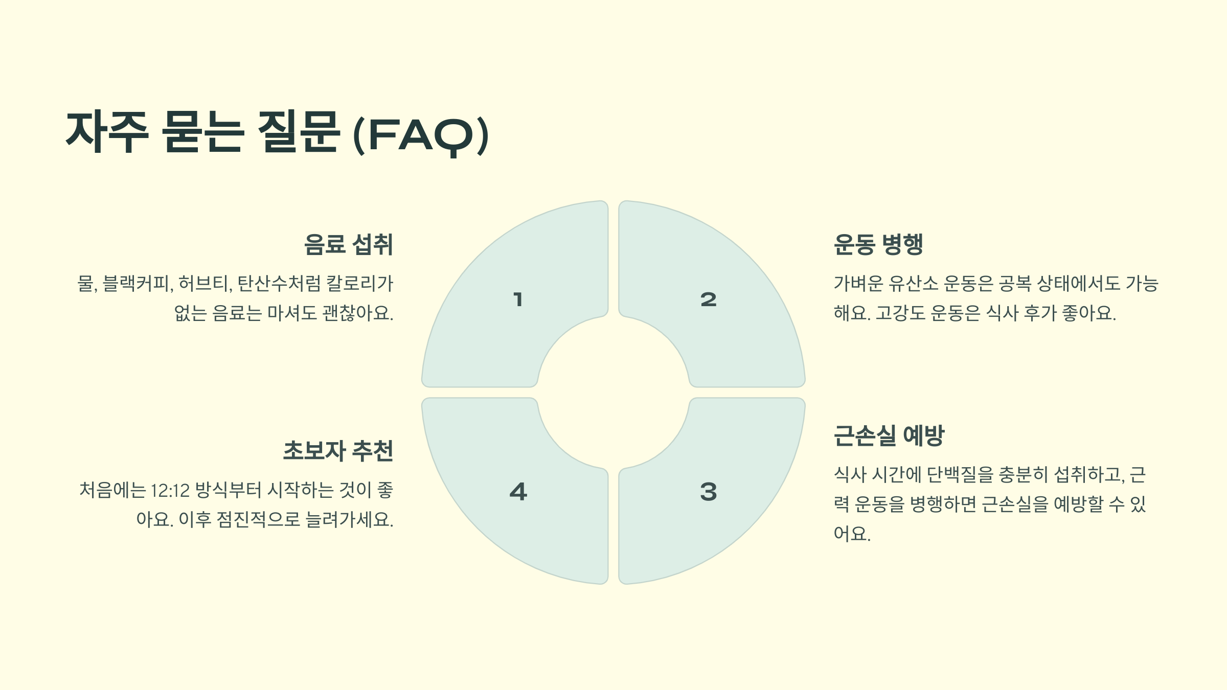 | 점진적으로 시작하기 | 처음에는 12:12 방식으로 시작하고 점점 공복 시간을 늘려가세요. |