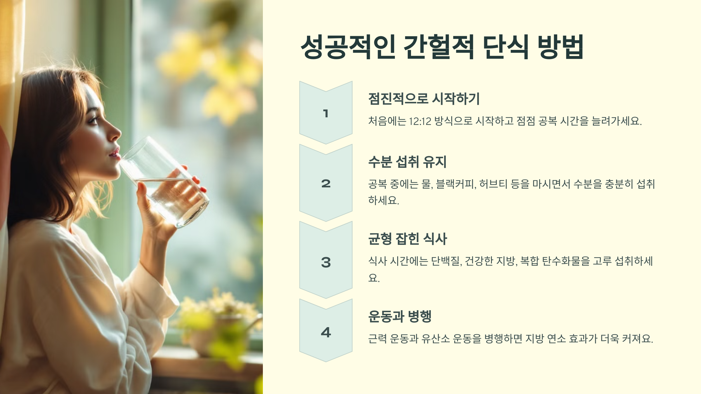 특히 처음 시작할 때는 12:12 방식(공복 12시간, 식사 12시간)으로 시작한 뒤, 점차 16:8 또는 18:6 방식으로 늘려가는 것이 좋아요. 이렇게 하면 몸이 자연스럽게 적응할 수 있어요.