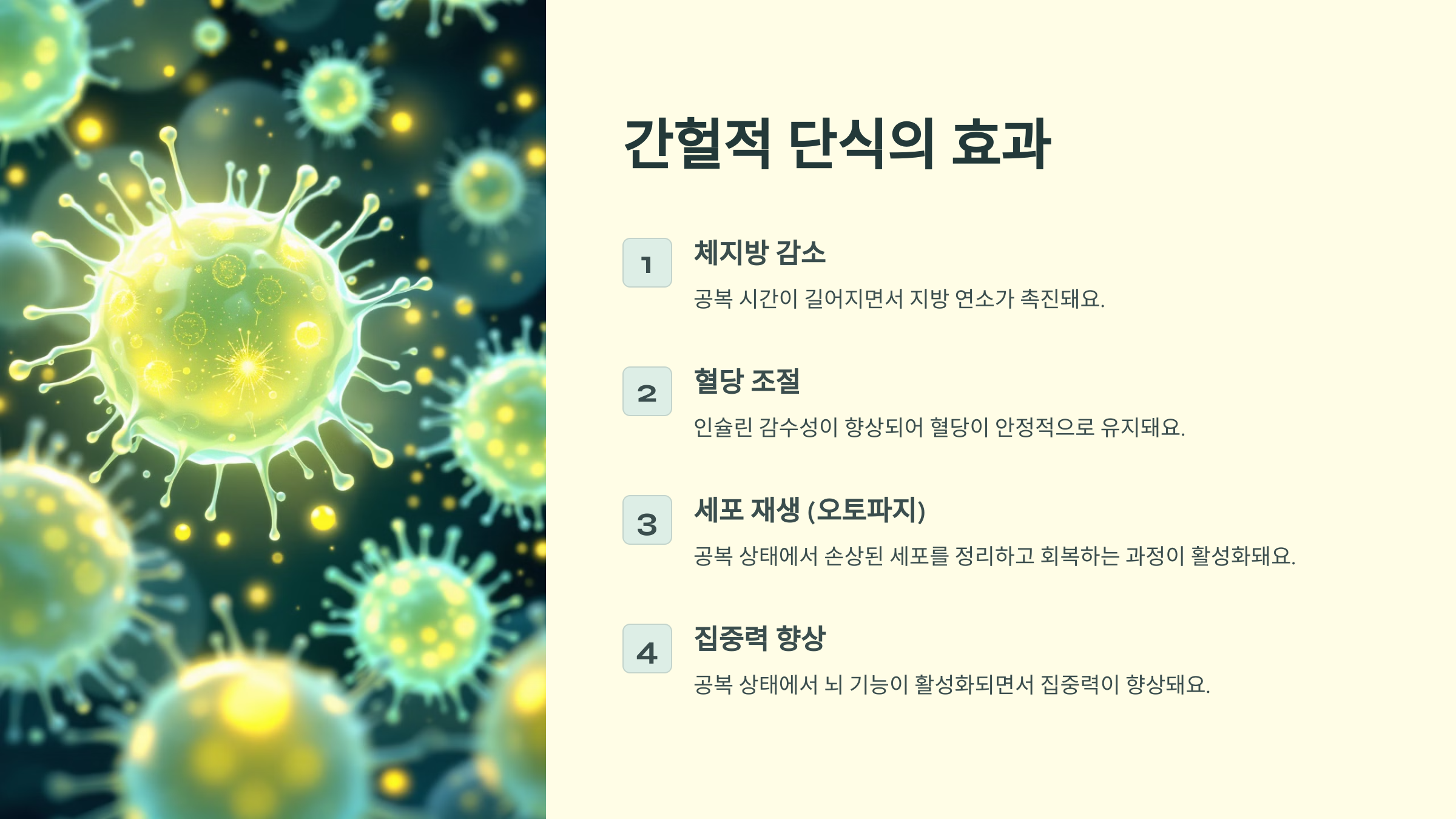 | 세포 재생 (오토파지) | 공복 상태에서 손상된 세포를 정리하고 회복하는 과정이 활성화돼요. |