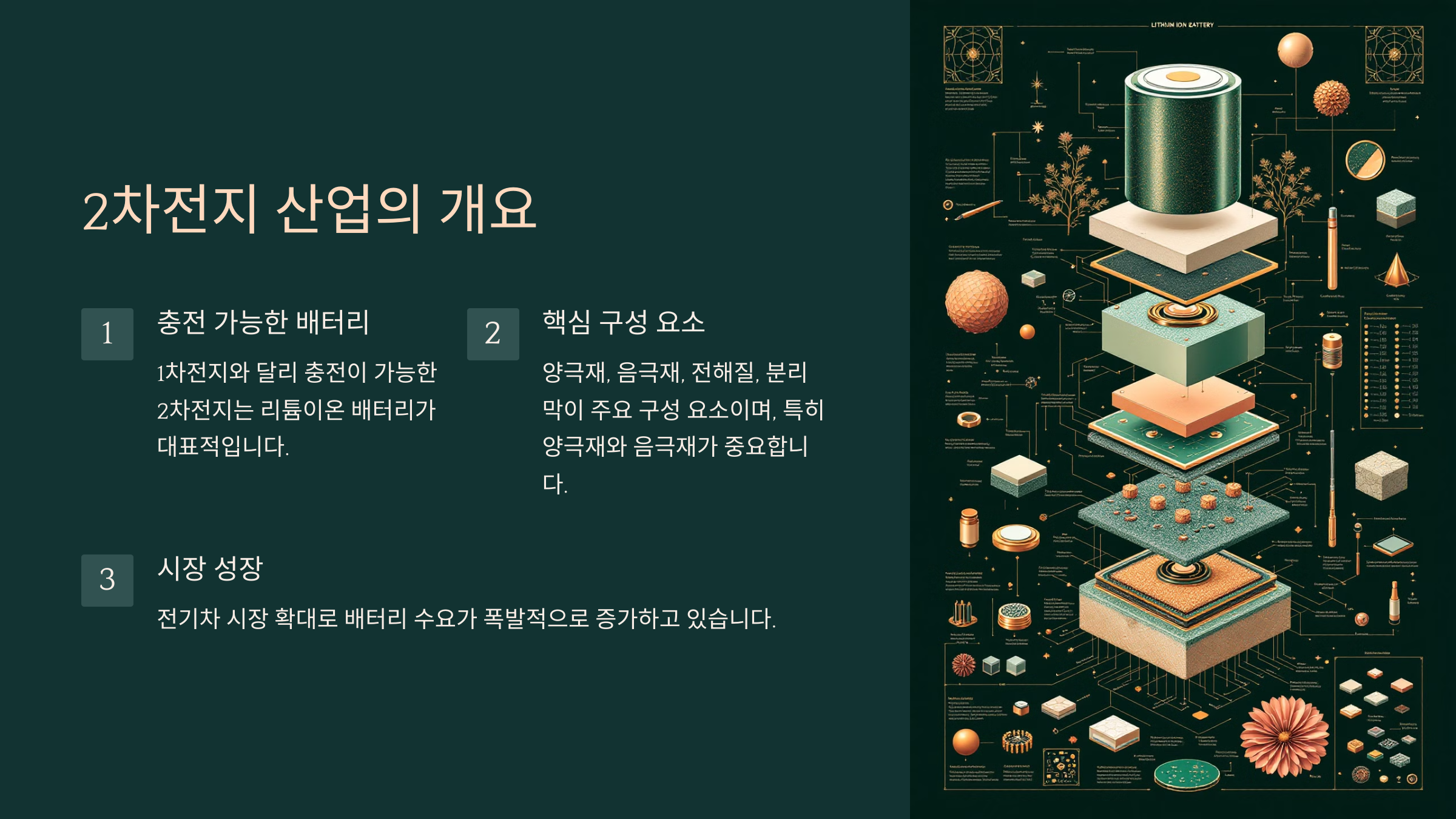 📌 2차전지의 핵심 구성 요소는 양극재, 음극재, 전해질, 분리막이에요. 이 중에서도 양극재와 음극재는 배터리 성능과 수명을 결정짓는 핵심 원료죠.
