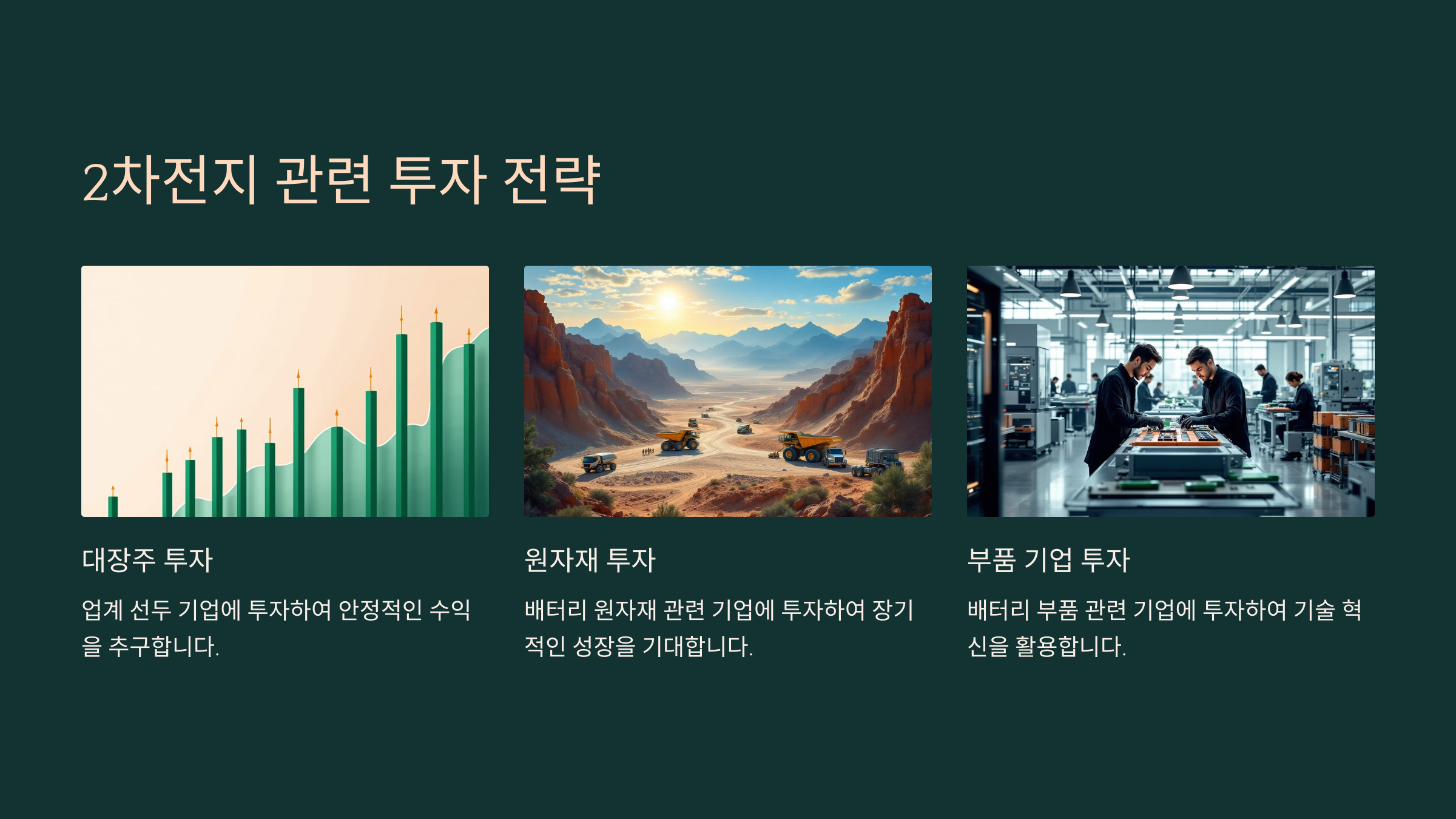 | 부품 기업 투자 | 배터리 관련 부품 기업 | 엘앤에프, 에코프로 | 고성장 가능성 | 경쟁 심화 |