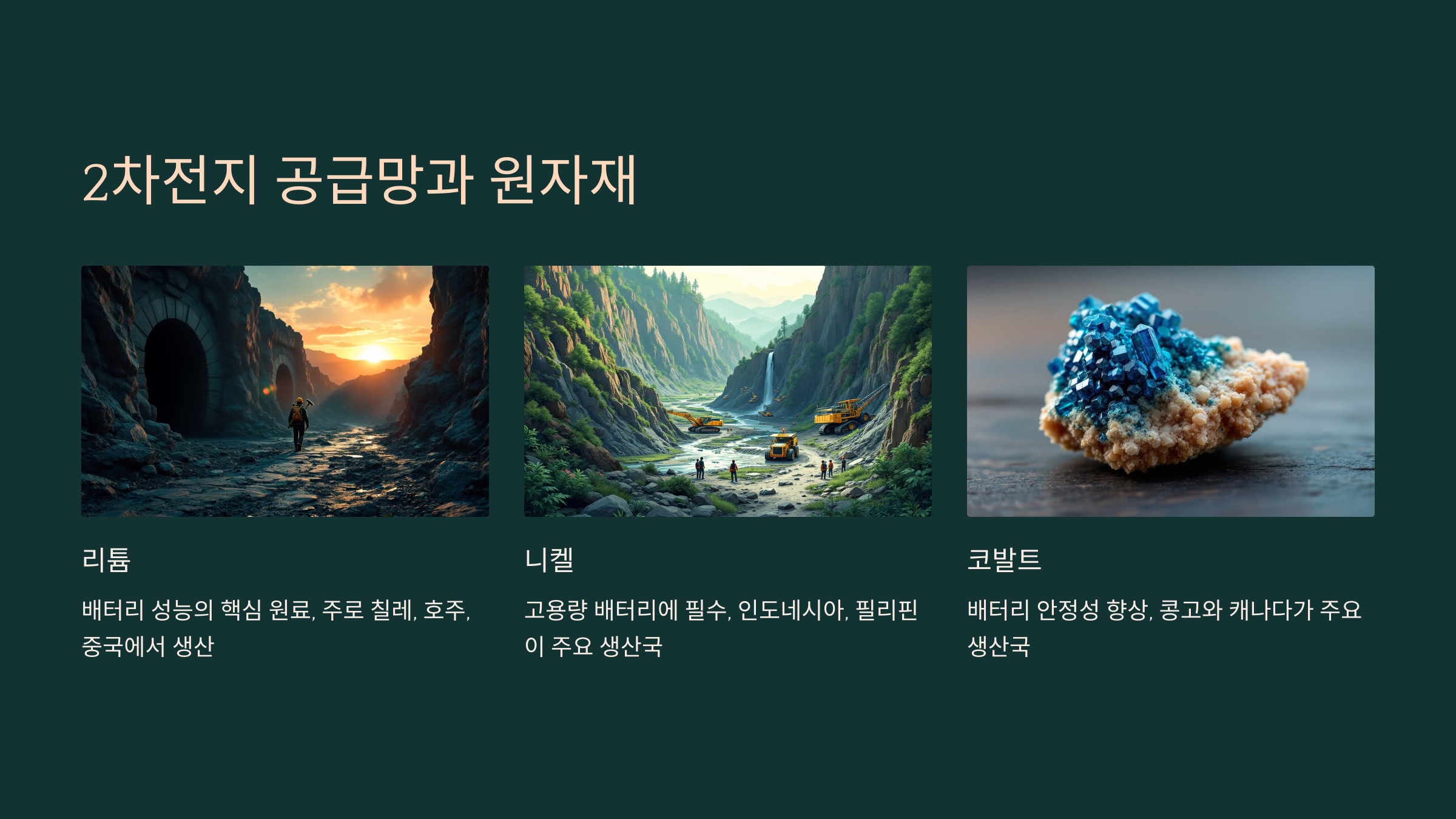 | 코발트 | 양극재 | 콩고, 캐나다 | 안정성 향상, 고가 원료 |