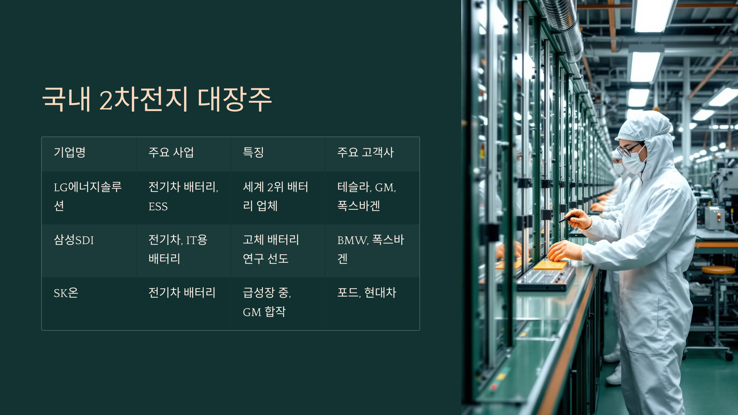 | SK온 | 전기차 배터리 | 급성장 중, GM 합작 | 포드, 현대차 |