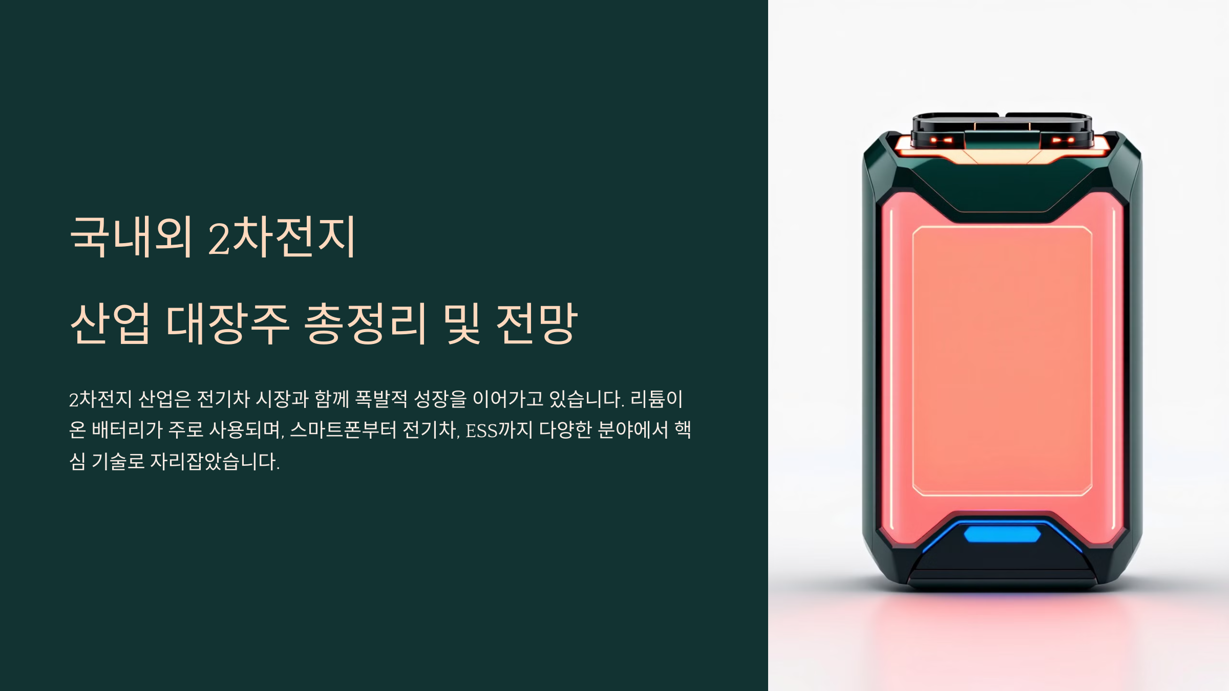 🚗 이번 글에서는 국내외 2차전지 대장주를 정리하고, 향후 전망과 투자 전략까지 분석해 볼게요. 2차전지 산업에 관심 있는 분들에게 유용한 정보가 될 거예요.