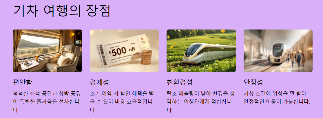 이처럼 기차는 편안함, 경제성, 친환경성을 동시에 갖춘 매력적인 교통수단입니다.
