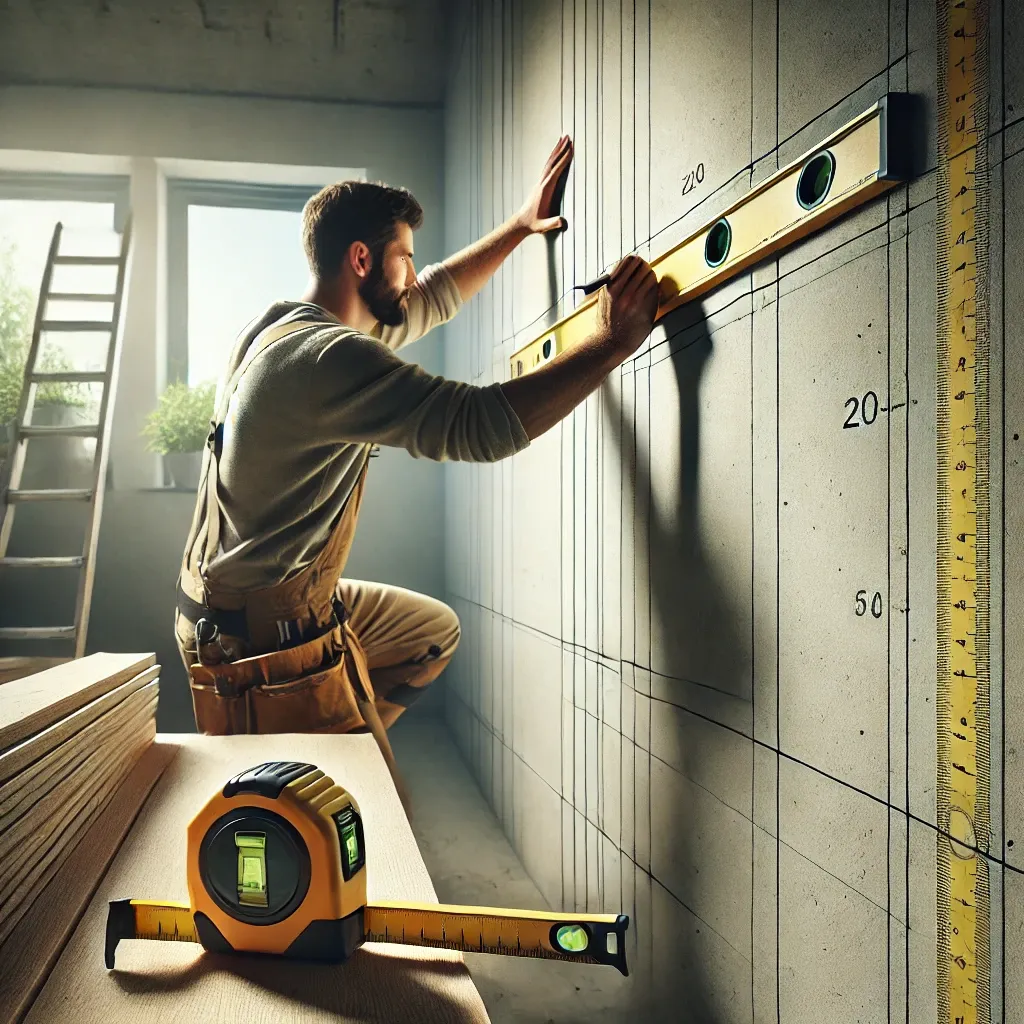 내장재 시공의 첫 단계는 정확한 측정과 마킹입니다.