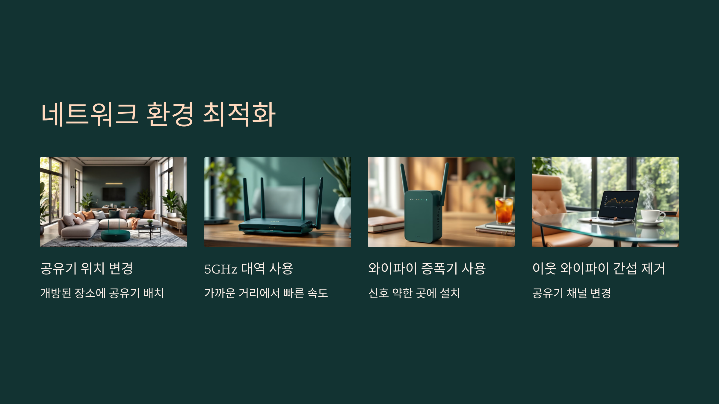 | 공유기 위치 변경 | 거실 중앙 등 개방된 장소에 배치, 장애물 제거 |