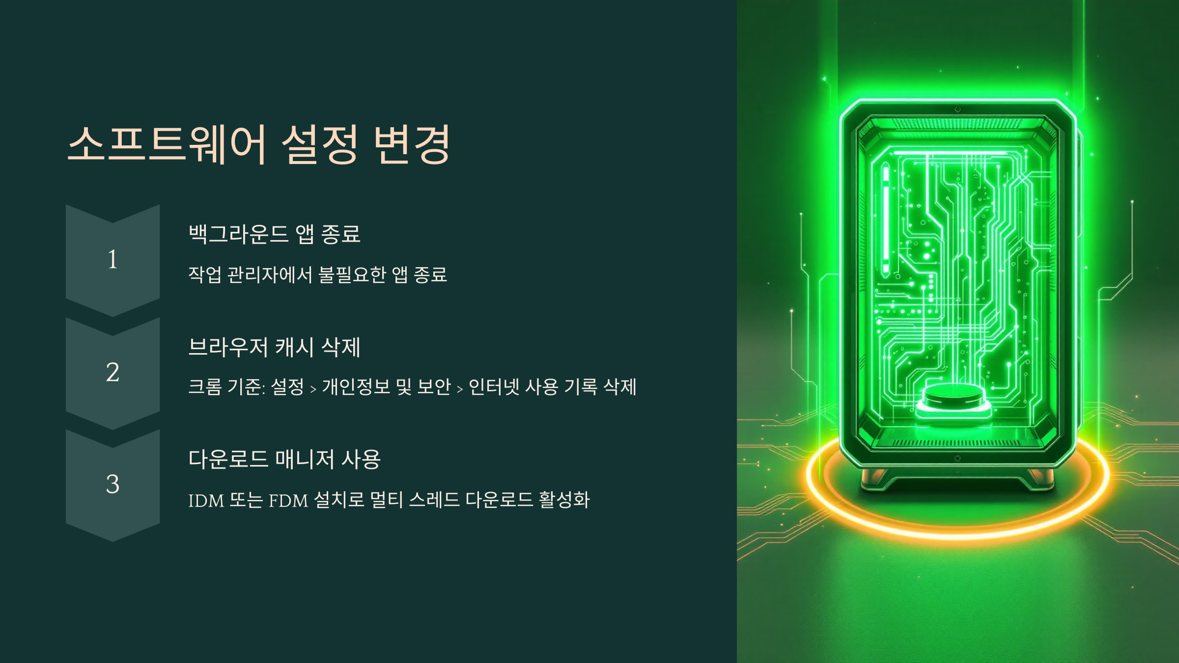 하드웨어 최적화만 잘해도 다운로드 속도를 몇 배로 높일 수 있어요! 이제 소프트웨어 설정을 조정하는 방법을 알아볼까요? 😊