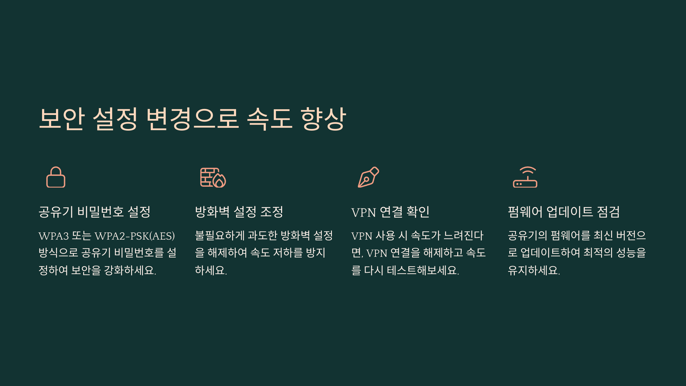 네트워크 환경을 개선하면 와이파이 속도가 안정적으로 유지돼요. 이제 보안 설정을 변경하여 속도를 더 높이는 방법을 알아볼까요? 🔒🚀