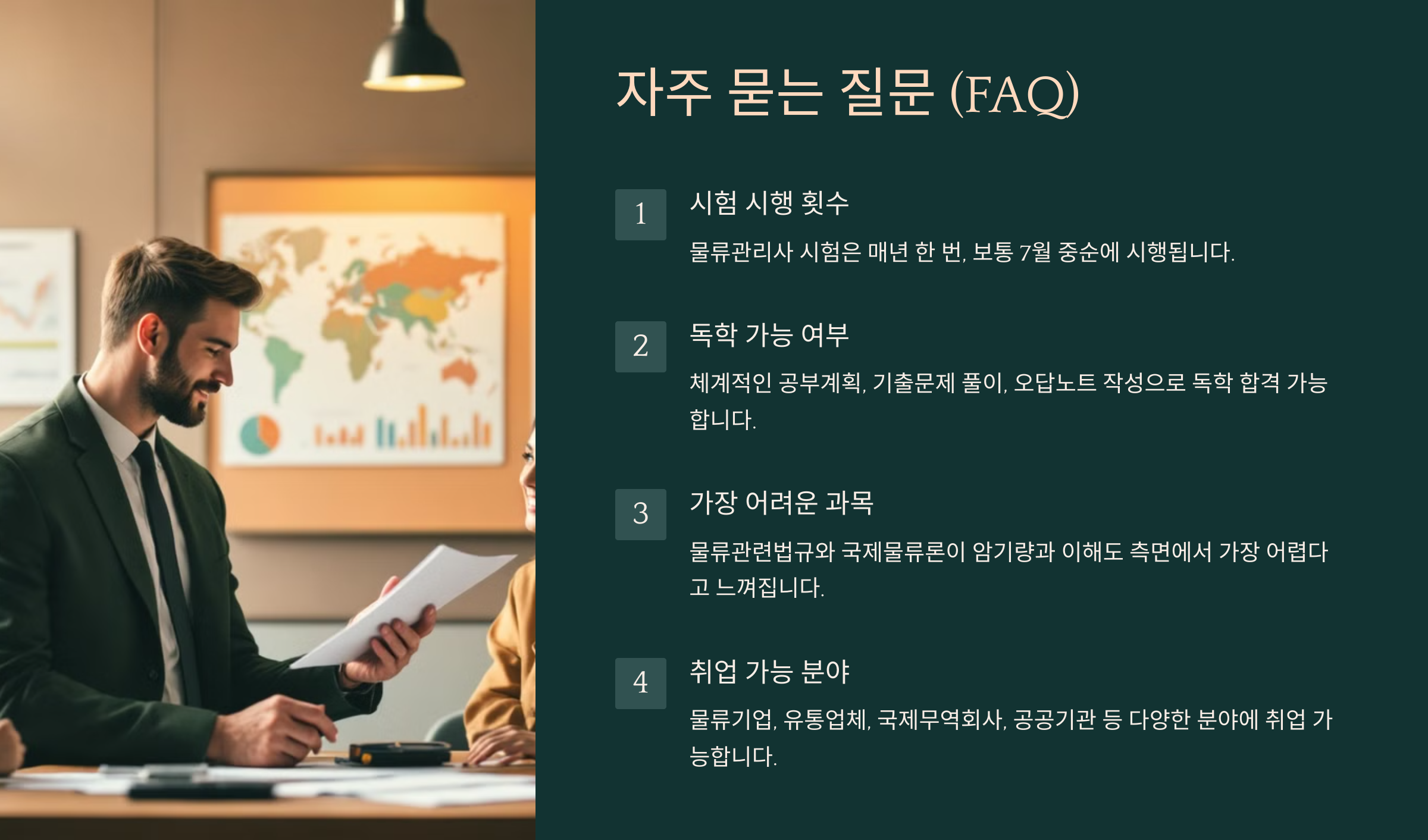 A3. 많은 수험생이 **물류관련법규**와 **국제물류론**을 가장 어렵다고 느껴요. **법규 과목**은 **암기할 내용**이 많고, **국제물류론**은 **수출입 절차와 인코텀즈**를 정확히 이해해야 해요.😊