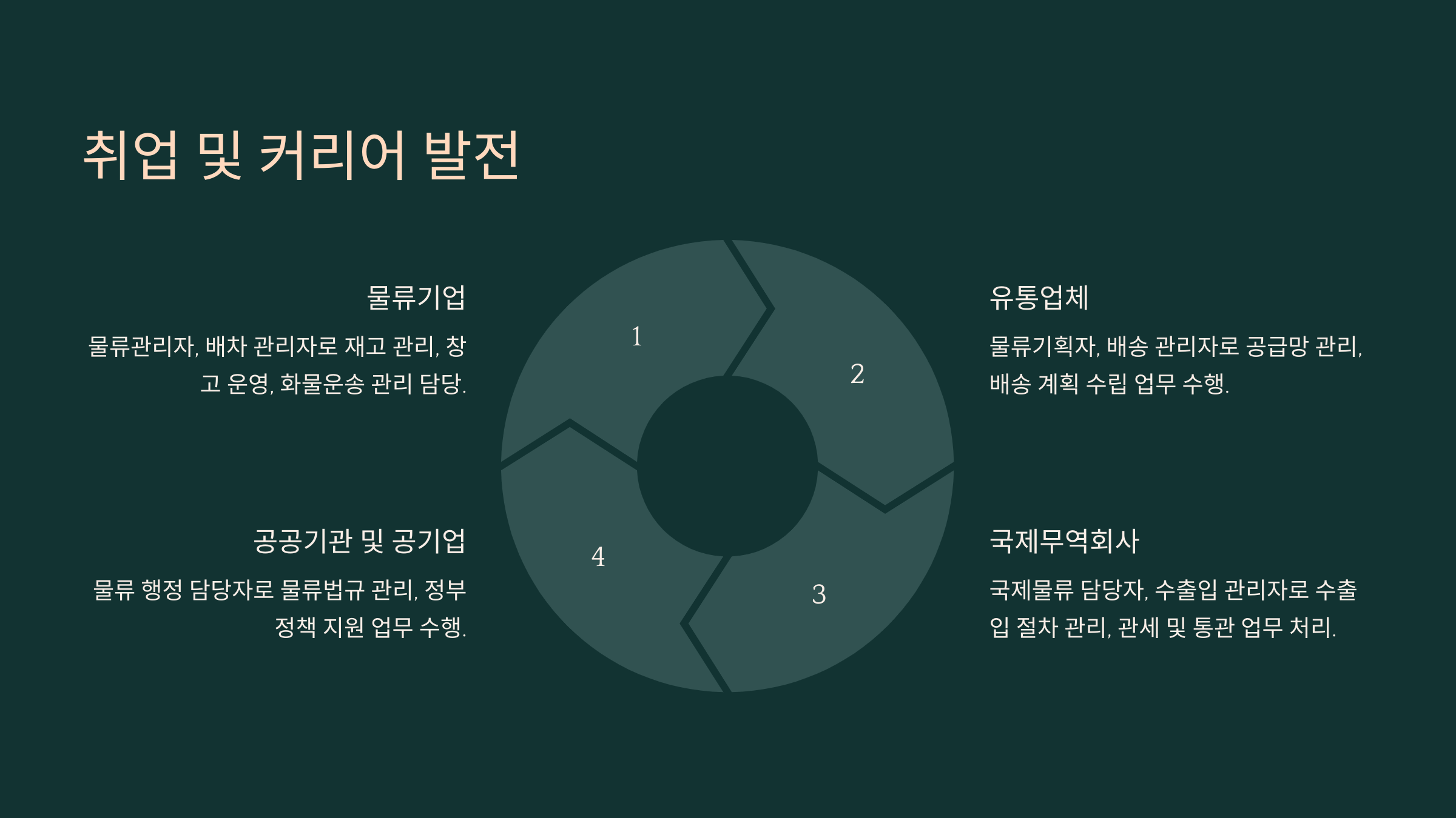 - **고급 단계:** **물류 컨설턴트** 또는 **국제물류 전문가**로 활동하며 **더 높은 연봉과 승진** 기회를 잡으세요.