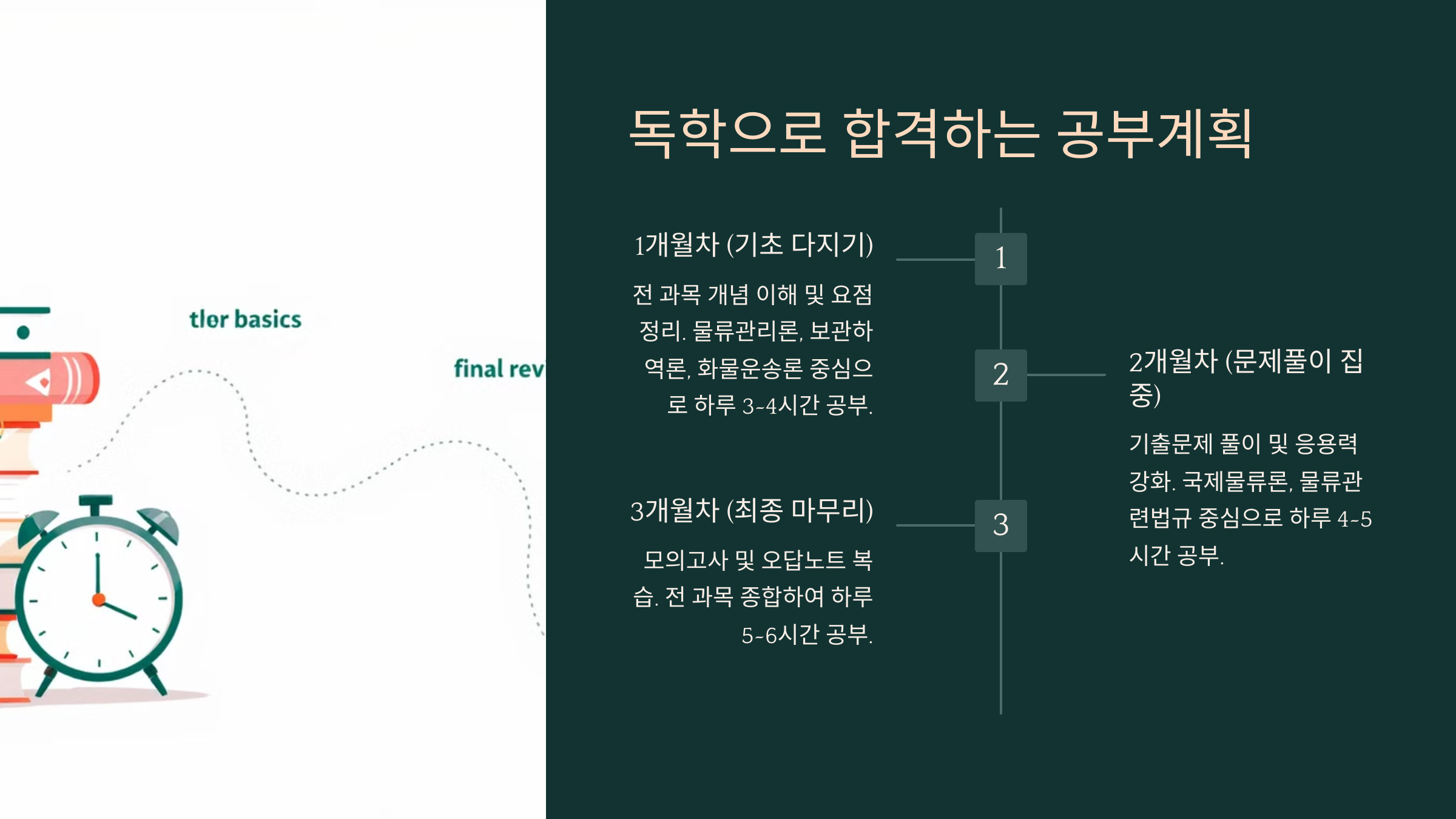 | 2개월차 (문제풀이 집중) | 기출문제 풀이 및 응용력 강화 | 국제물류론, 물류관련법규 | 4~5시간 |
