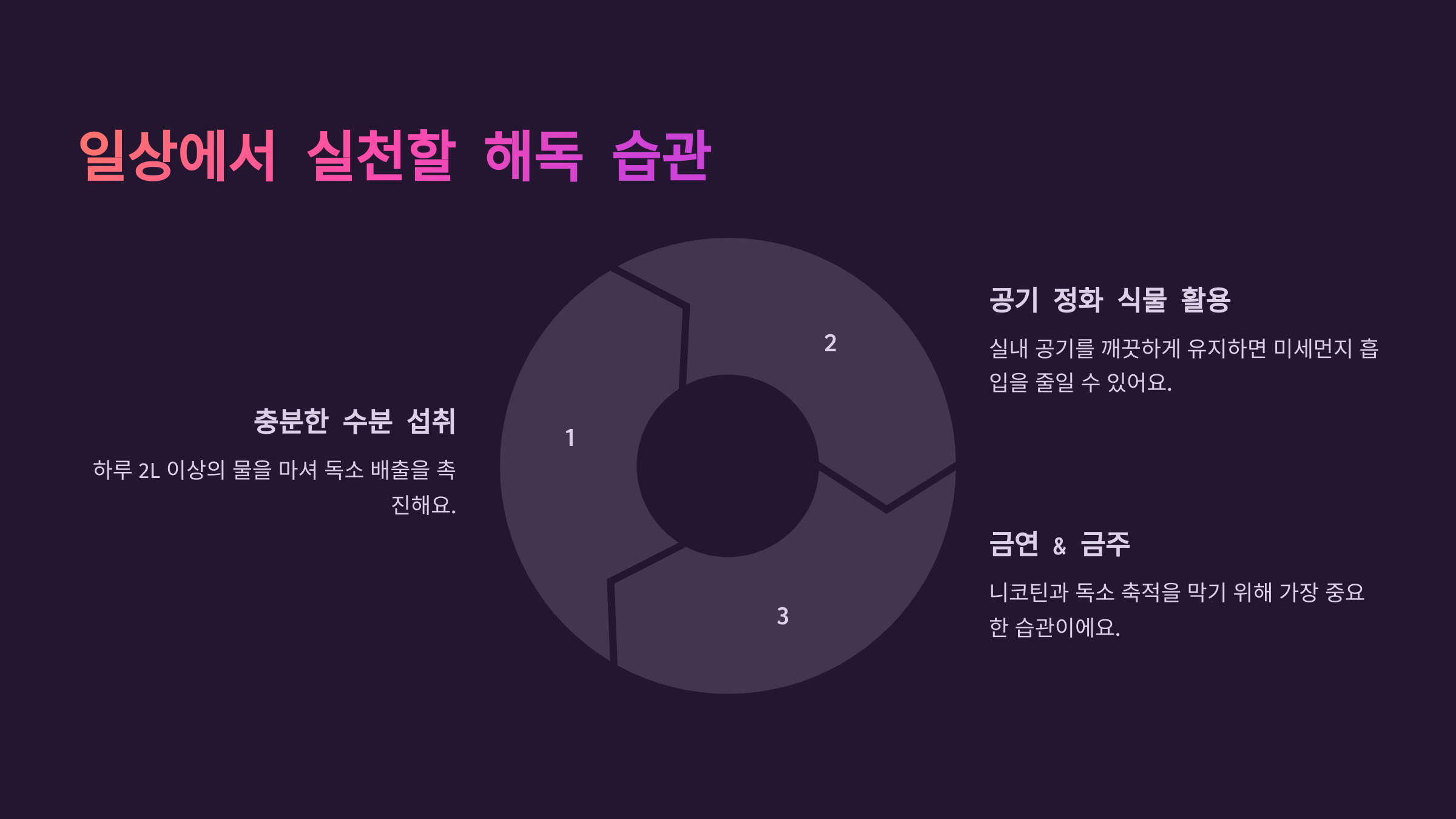 ✔ **금연 & 금주**: 니코틴과 독소 축적을 막기 위해 가장 중요한 습관이에요.
