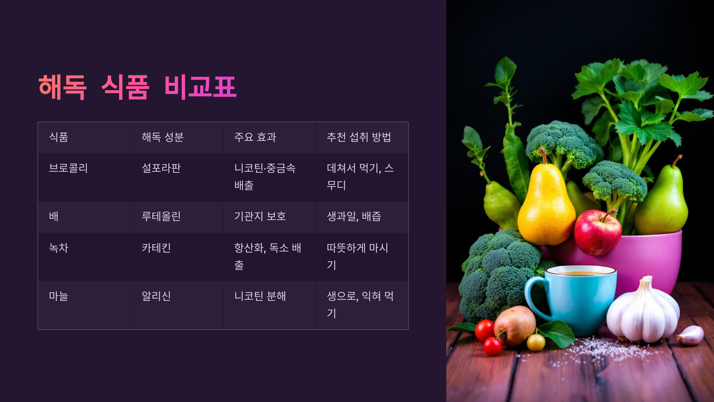 ✔ **브로콜리**: 설포라판 성분이 간 해독을 촉진하고, 니코틴과 중금속 배출을 돕는 효과가 있어요.