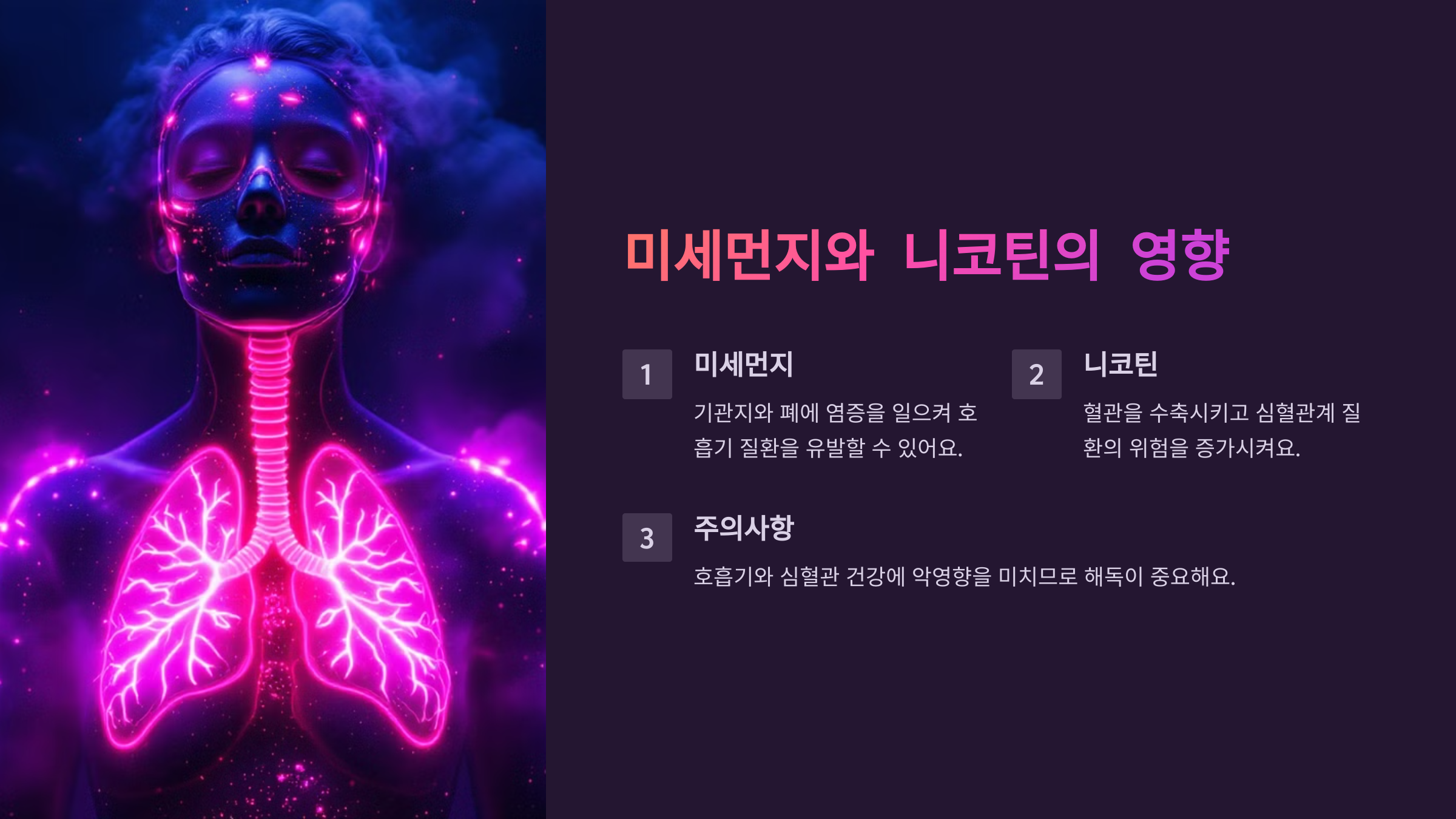 이제 미세먼지와 니코틴이 우리 몸에 미치는 영향부터 효과적인 해독 방법까지 자세히 알아볼까요? 🌿