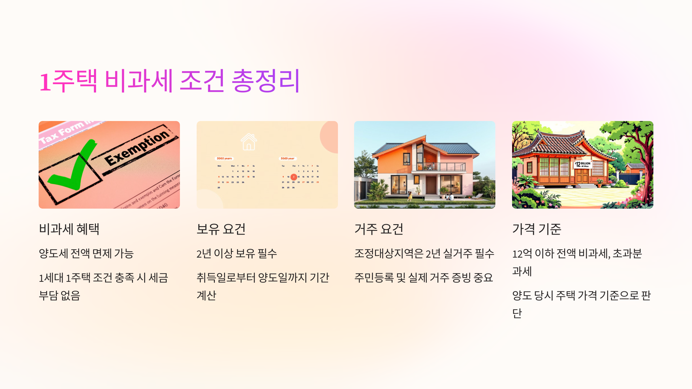 양도세를 아예 내지 않아도 되는 방법이 있어요. 바로 1세대 1주택 비과세 조건을 만족하는 거예요.
