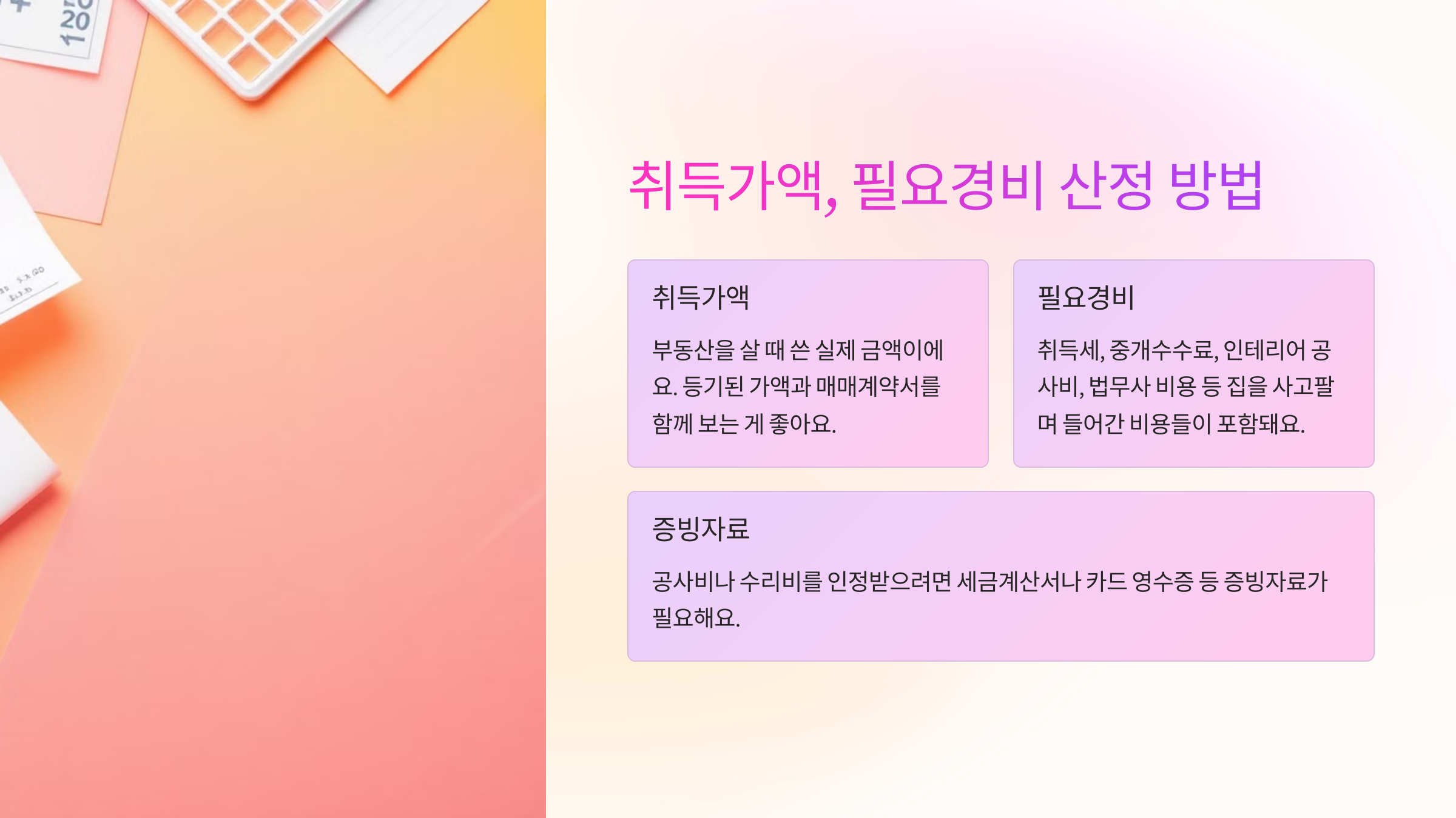 양도세 계산에서 가장 중요한 항목 중 하나가 '필요경비'예요. 이를 제대로 챙기면 세금을 수백만 원 줄일 수 있어요.