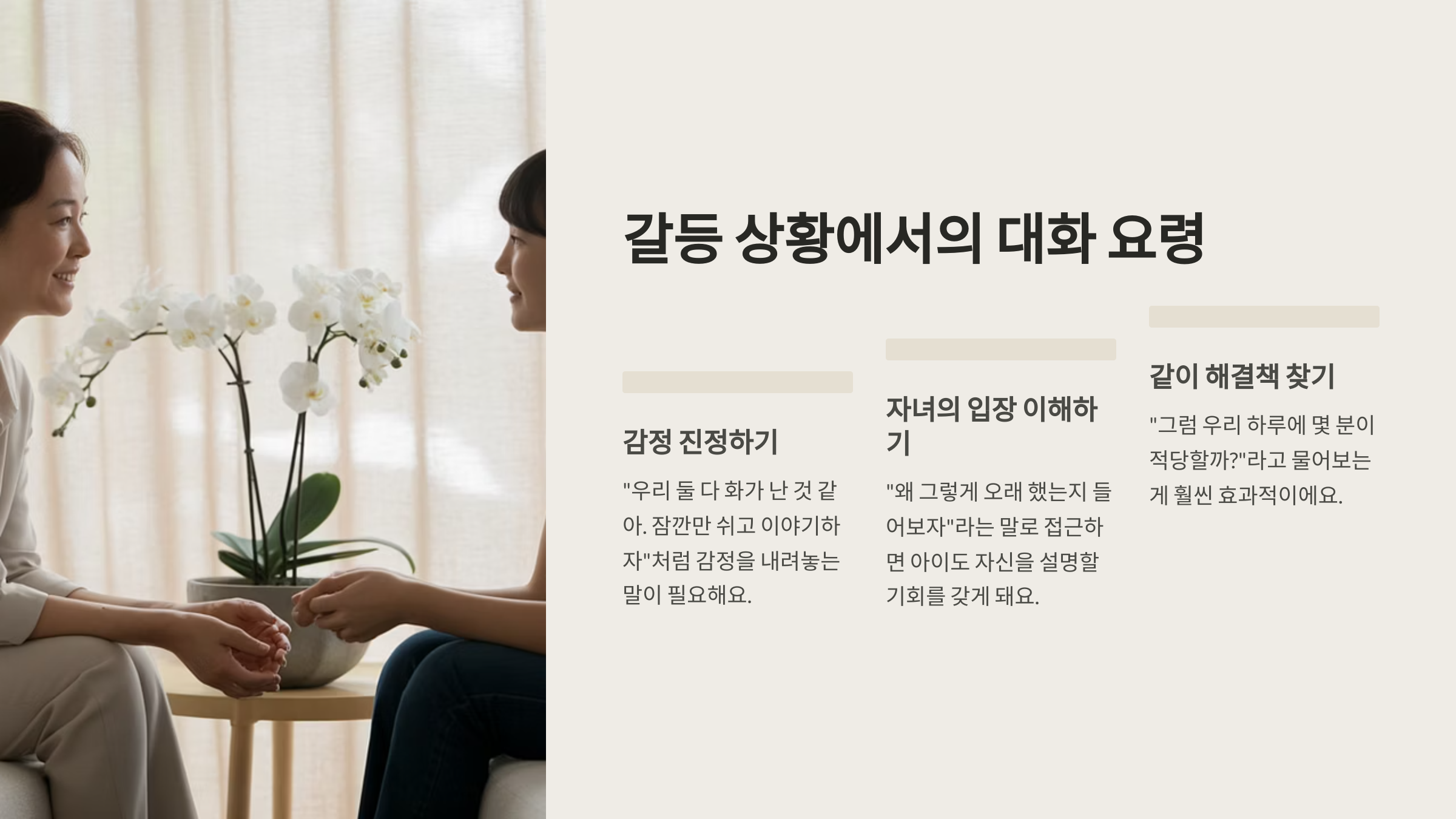 세 번째는 ‘같이 해결책 찾기’예요. “앞으로는 30분만 해”라고 명령하기보단 “그럼 우리 하루에 몇 분이 적당할까?”라고 물어보는 게 훨씬 효과적이에요. 함께 규칙을 정하면 자녀의 수용도도 높아져요. 🤝