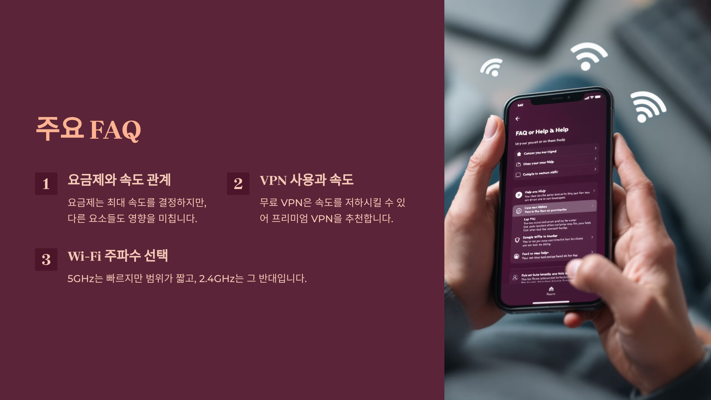 A3. 5GHz Wi-Fi는 더 빠른 속도를 제공하지만, 신호 범위는 2.4GHz보다 짧아요. 기기와 라우터가 가까우면 5GHz를 추천해요.
