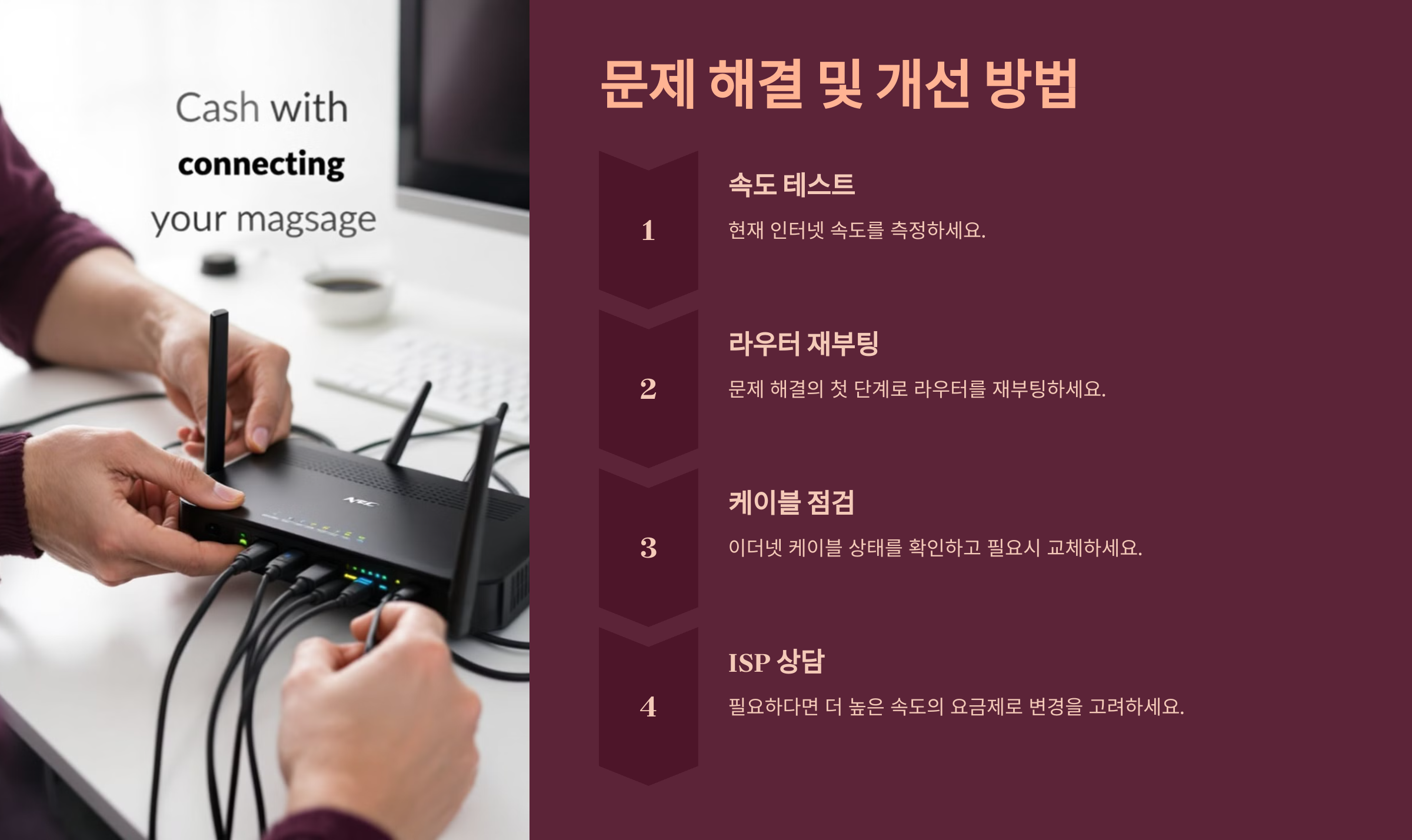라우터 재부팅 후에도 문제가 지속된다면, 케이블 연결 상태를 점검하세요. 특히, 오래된 이더넷 케이블은 속도 저하의 원인이 될 수 있어요. 가능하다면 최신 규격인 Cat6 또는 Cat7 케이블을 사용하는 것이 좋아요.