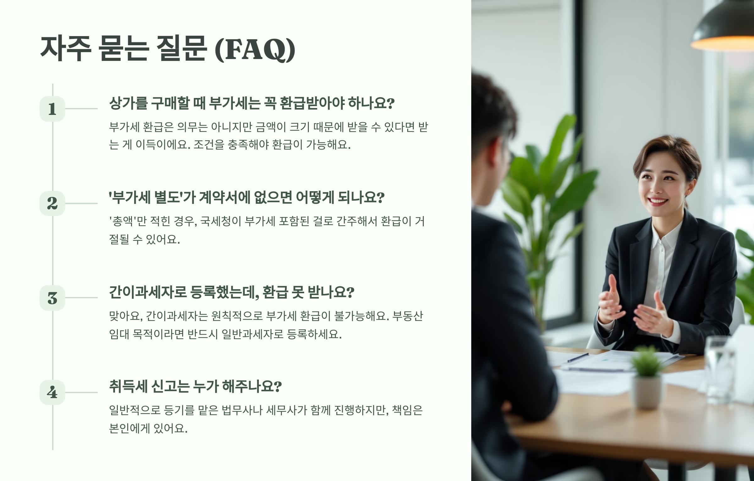 A8. 부가세 환급을 위해선 상가를 인도받기 전이나 계약금/잔금 납부 시점에 맞춰 세금계산서를 받아야 해요. 잊지 말고 챙기는 게 핵심이에요!