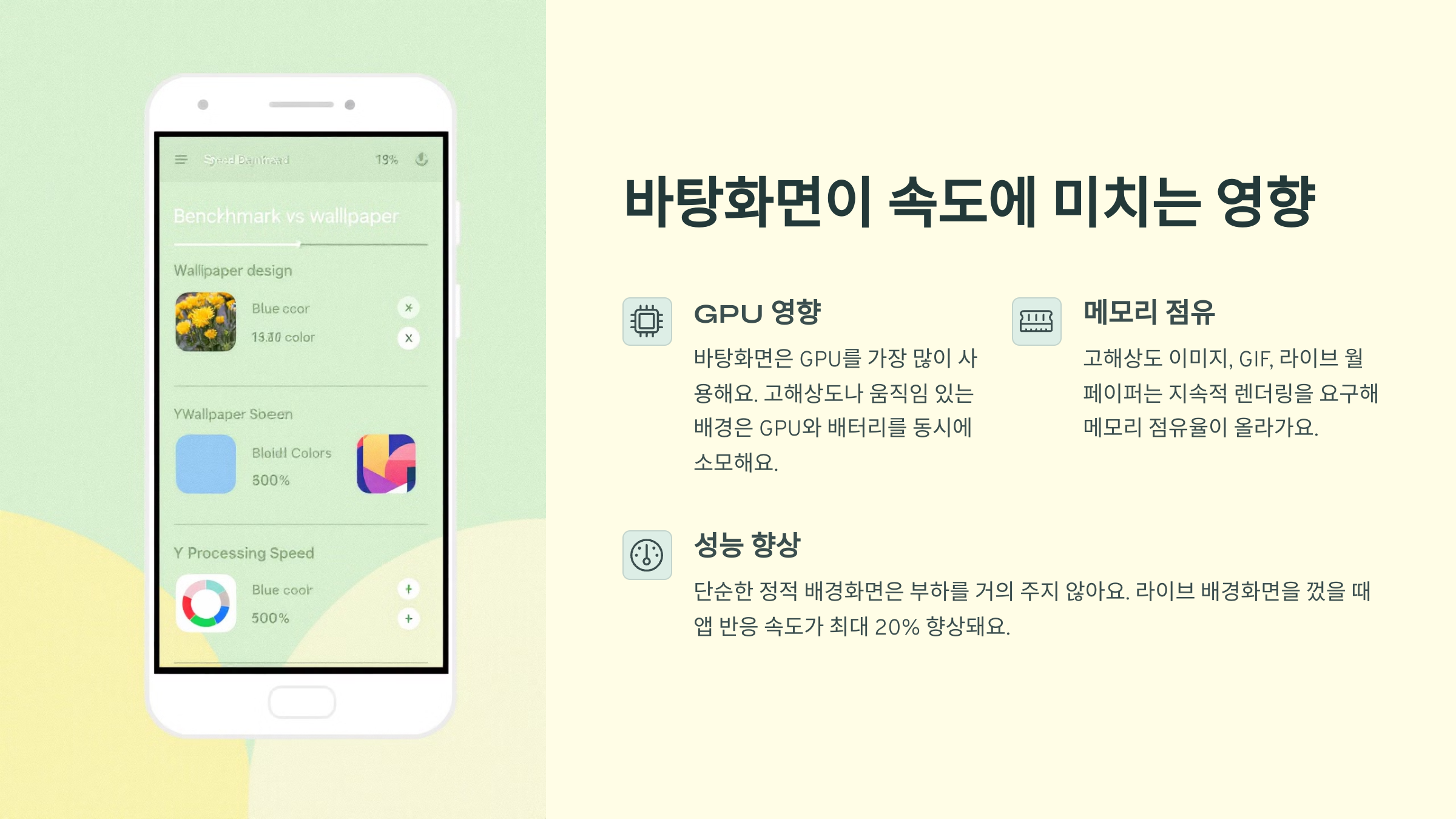 스마트폰의 속도는 CPU, 램(RAM), 저장공간만 영향을 주는 게 아니에요. GPU(그래픽 처리 장치)도 큰 역할을 하는데, 이걸 가장 많이 사용하는 게 바로 바탕화면이에요! 🧠