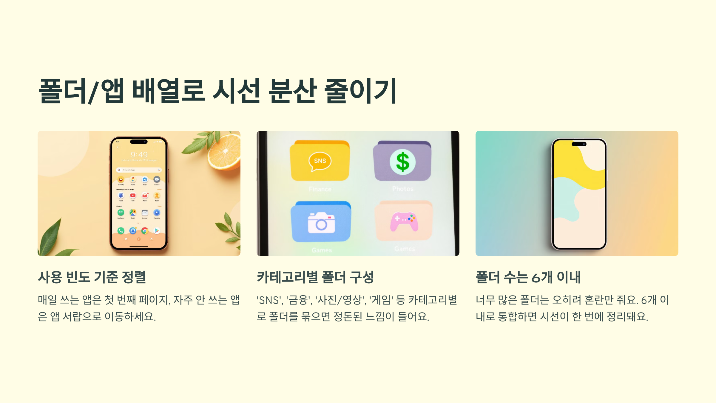 그래서 스마트폰을 더 빠르고 깔끔하게 쓰고 싶다면, 앱 아이콘과 폴더 정리부터 시작해야 해요. 위치, 색상, 사용 빈도에 따라 나누기만 해도 속도가 빨라져요. 🚀