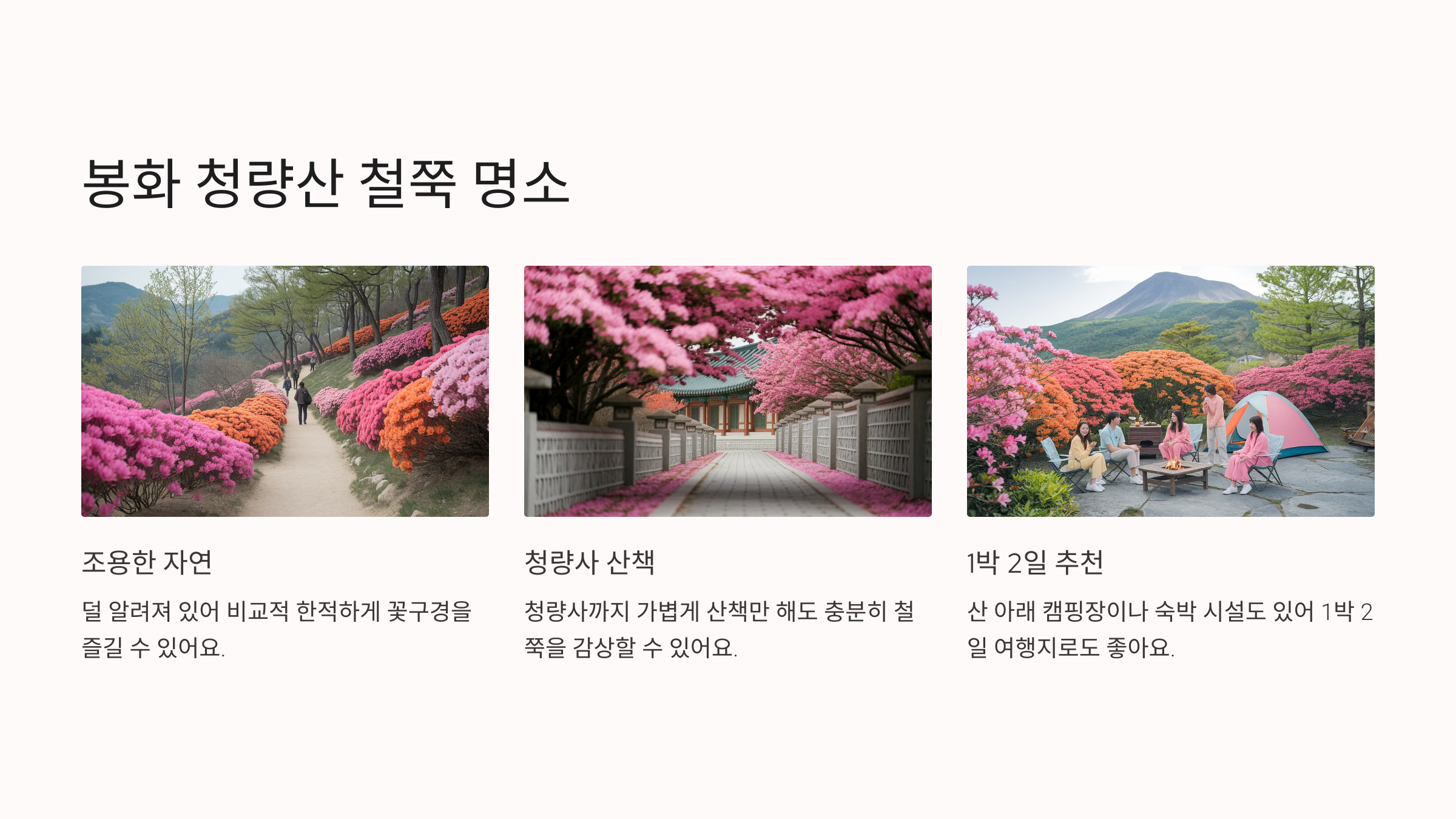 경상북도 봉화에 위치한 청량산은 조용하고 평화로운 자연 속에서 철쭉을 즐기기에 정말 좋은 명소예요. 다른 유명한 철쭉 군락지보다 덜 알려져 있어 비교적 한적하게 꽃구경을 즐길 수 있는 점이 매력적이에요.