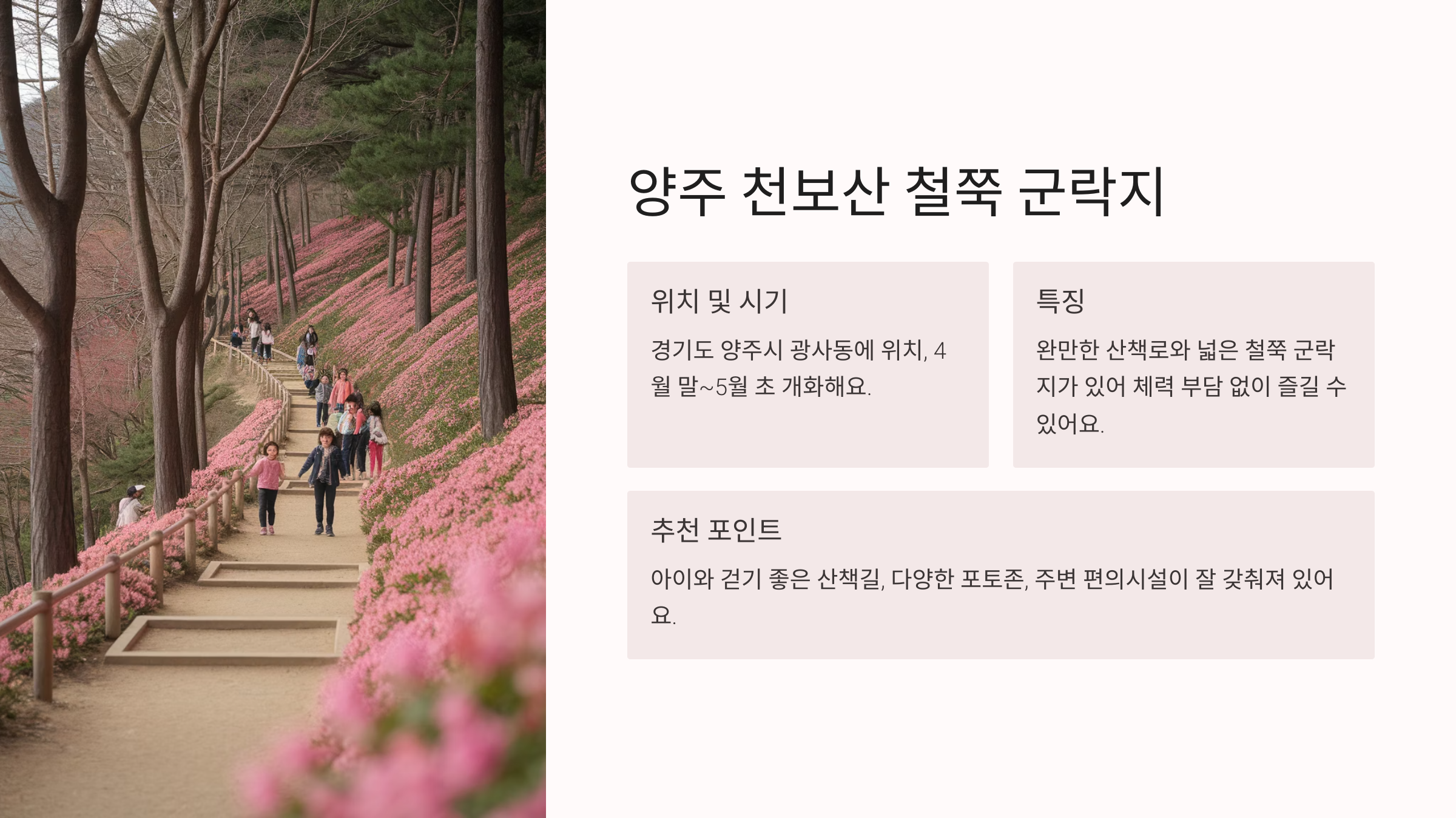 양주 천보산은 수도권 근교에서 철쭉을 즐기기에 최적의 장소에요. 접근성도 좋고, 산책로도 편해서 아이들과 함께 꽃놀이 하기 최고랍니다. 다음은 경남 지역 대표 철쭉 명소인 합천 황매산으로 넘어가볼게요!