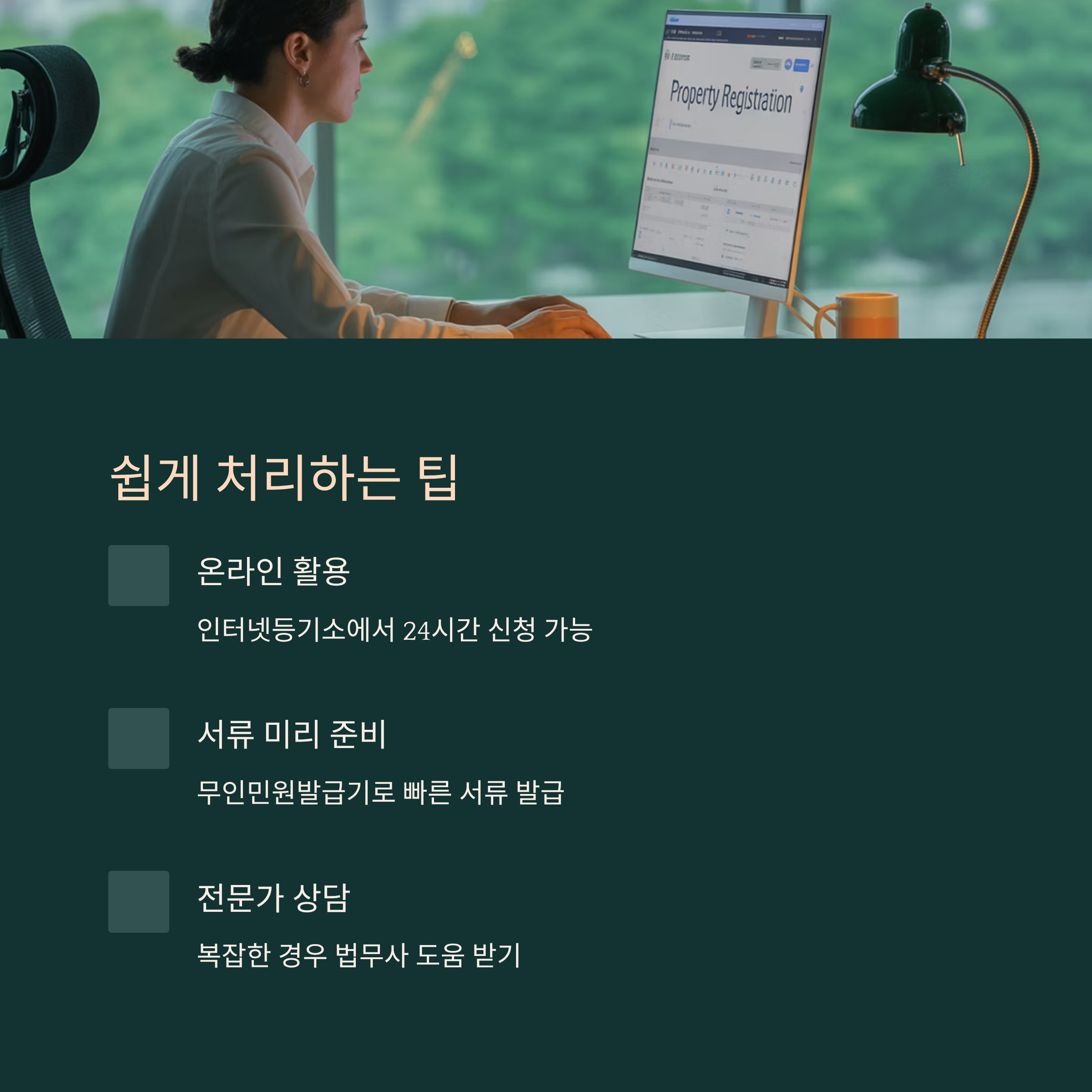 인터넷등기소(https://www.iros.go.kr)를 활용하면 집에서도 신청 가능하고, 정부24(https://www.gov.kr)에서 필요한 서류도 온라인 발급이 돼요. 무인민원발급기도 활용하면 시간과 비용을 아낄 수 있어요.