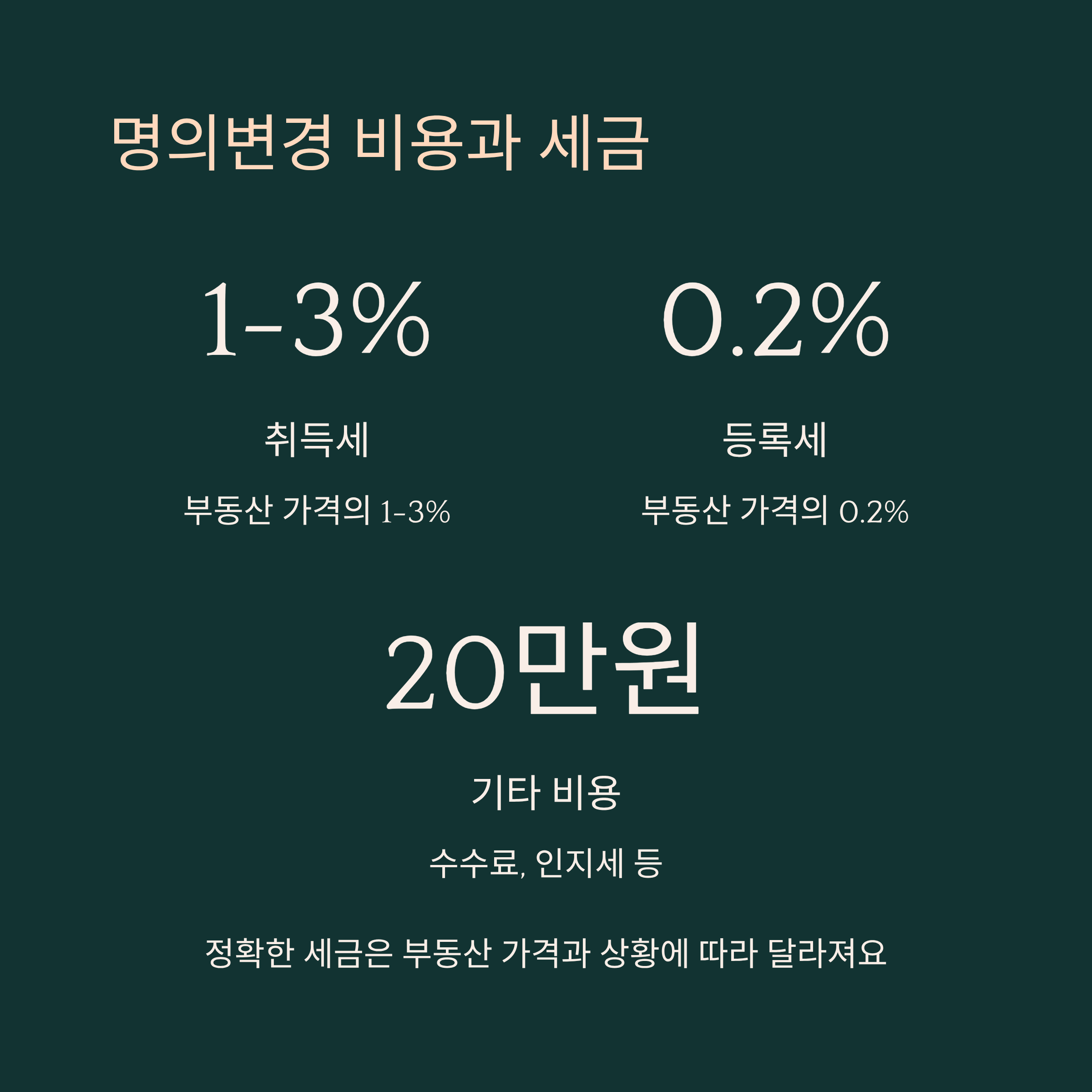 명의변경 시에는 몇 가지 세금과 수수료가 발생해요. 가장 기본적인 건 ‘취득세’예요. 일반적으로 부동산 공시가격의 4.6% 정도가 부과돼요. 단, 상속이나 증여일 경우에는 증여세 또는 상속세가 추가로 발생할 수 있어요.