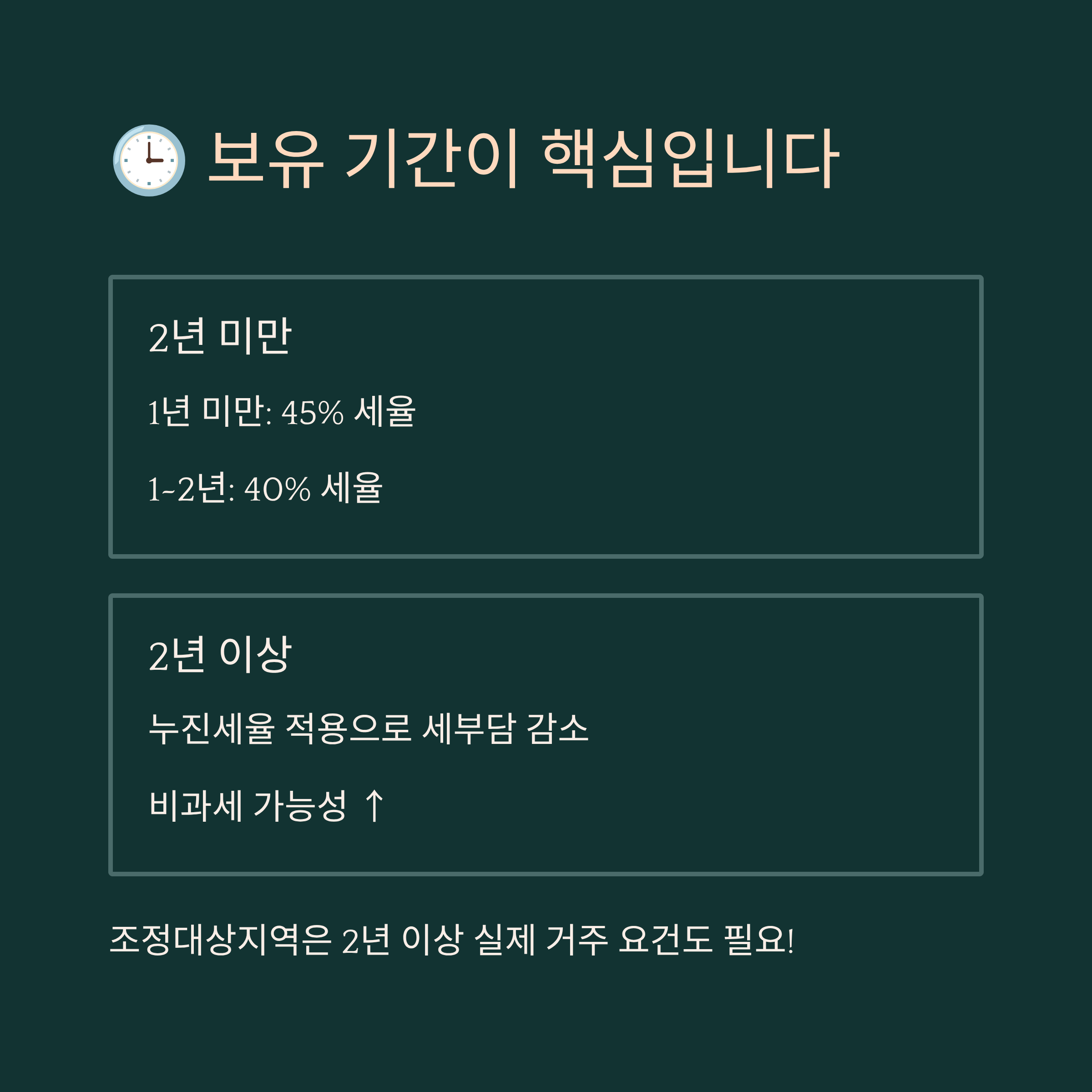 하지만 2년 이상 보유하면 누진세율로 계산되기 때문에 전체적으로 세부담이 줄어들고, 특히 1세대 1주택일 경우 '비과세' 요건도 충족할 수 있어요. 단, 조정대상지역이라면 '2년 이상 실제 거주' 요건도 충족해야 하죠.
