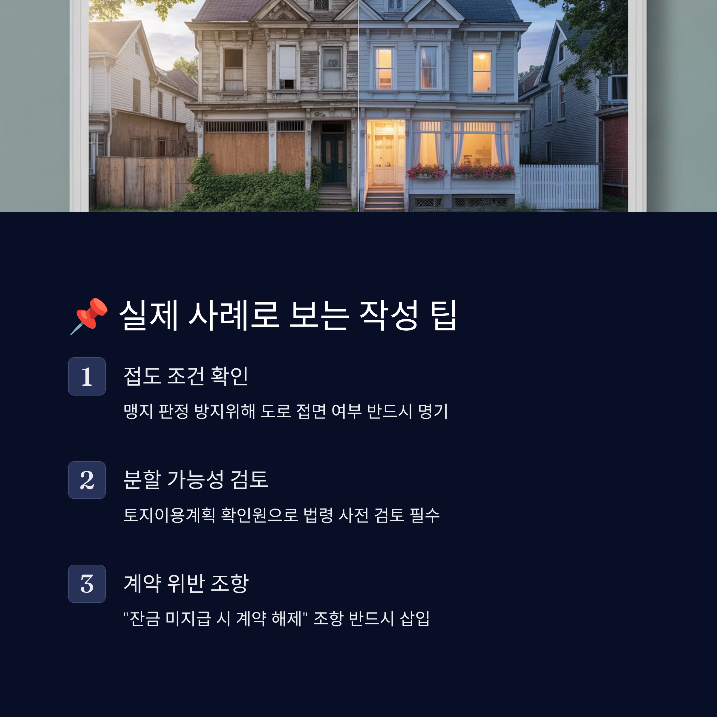 사례 3️⃣: C씨는 계약서를 급하게 작성하면서 ‘잔금 미지급 시 계약 무효’라는 문구를 생략했어요. 결과적으로 매수인이 잔금을 늦게 줬는데도 소유권 이전이 강제되었고, 계약 해제가 어렵게 됐죠. 계약서엔 항상 ‘어길 시 책임 조항’을 넣어야 해요.