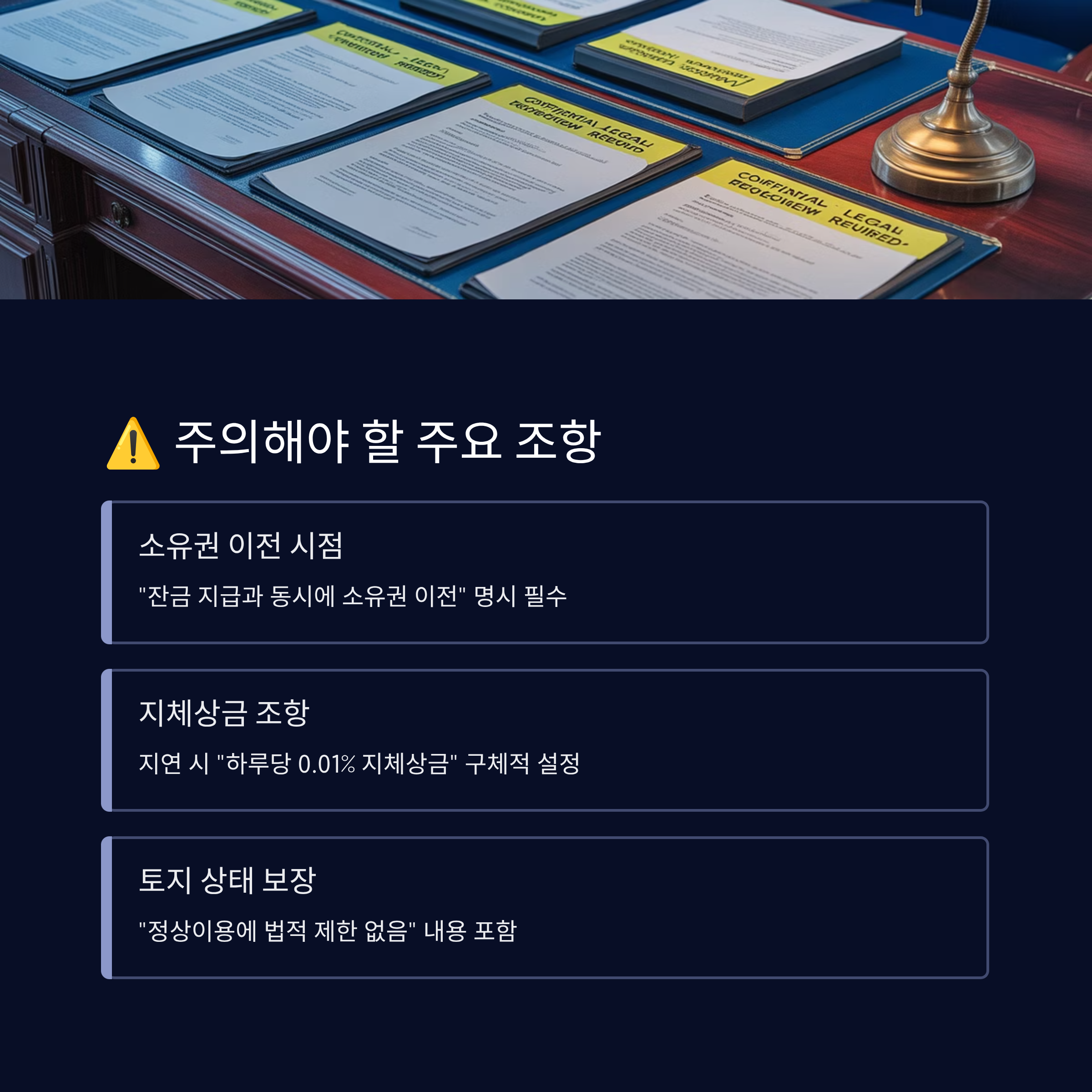 그리고 '토지 상태 보장' 조항도 중요해요. 예를 들어, 계약 당시에는 평지로 보였지만 실제로는 진입로가 없는 맹지였다거나, 환경오염 토지였던 경우 큰 피해를 볼 수 있어요. "계약 체결일 기준, 토지는 정상이용에 법적 제한이 없다"는 내용을 넣는 게 좋아요.