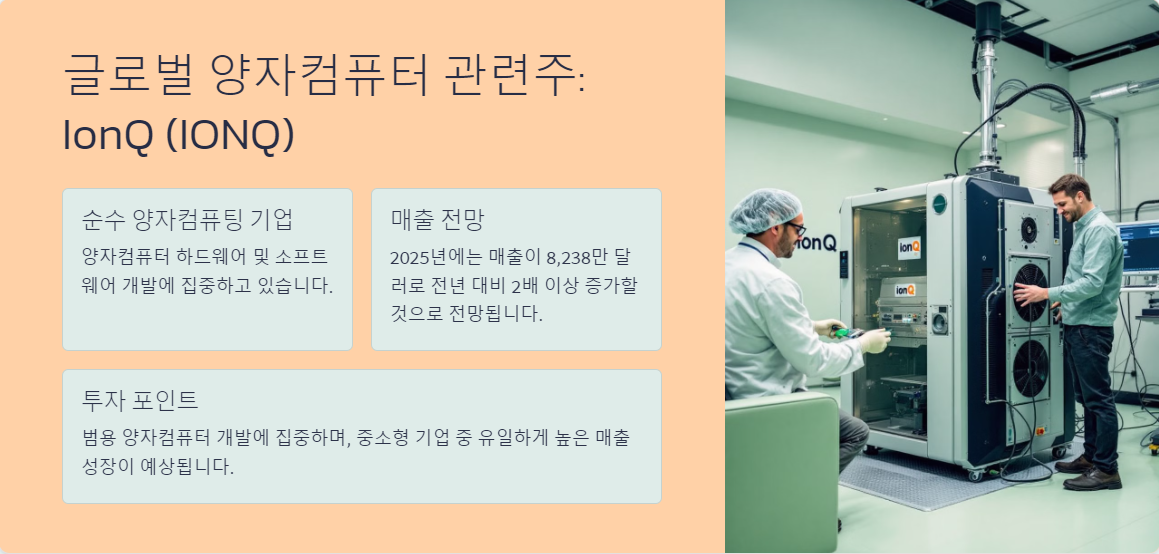 IonQ는 순수 양자컴퓨팅 기업으로, 양자컴퓨터 하드웨어 및 소프트웨어 개발에 집중하고 있습니다. 2025년에는 매출이 8,238만 달러로 전년 대비 2배 이상 증가할 것으로 전망됩니다.