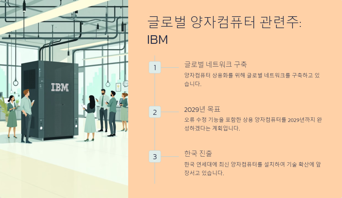 IBM은 양자컴퓨터 상용화를 위해 글로벌 네트워크를 구축하고 있습니다. 특히 오류 수정 기능을 포함한 상용 양자컴퓨터를 2029년까지 완성하겠다는 계획을 가지고 있으며, 한국 연세대에도 최신 양자컴퓨터를 설치하여 기술 확산에 앞장서고 있습니다.