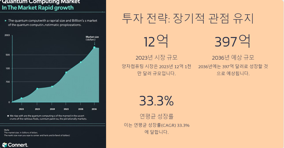 양자컴퓨팅 시장은 2023년 12억 1천만 달러에서 2036년에는 397억 달러로 성장할 것으로 예상되며, 이는 연평균 성장률(CAGR) 33.3%에 달합니다. 기술 상업화의 초기 단계인 현재, 장기적인 관점에서 투자를 고려해야 합니다.