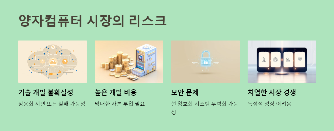 마지막으로, 시장 경쟁도 치열한 상황이에요. 미국, 중국, 유럽 등 다양한 국가와 기업들이 양자컴퓨터 개발에 뛰어들면서, 특정 기업의 독점적 성장이 어렵게 될 가능성도 있어요. 이런 경쟁 상황은 투자자들에게 리스크로 작용할 수 있답니다.