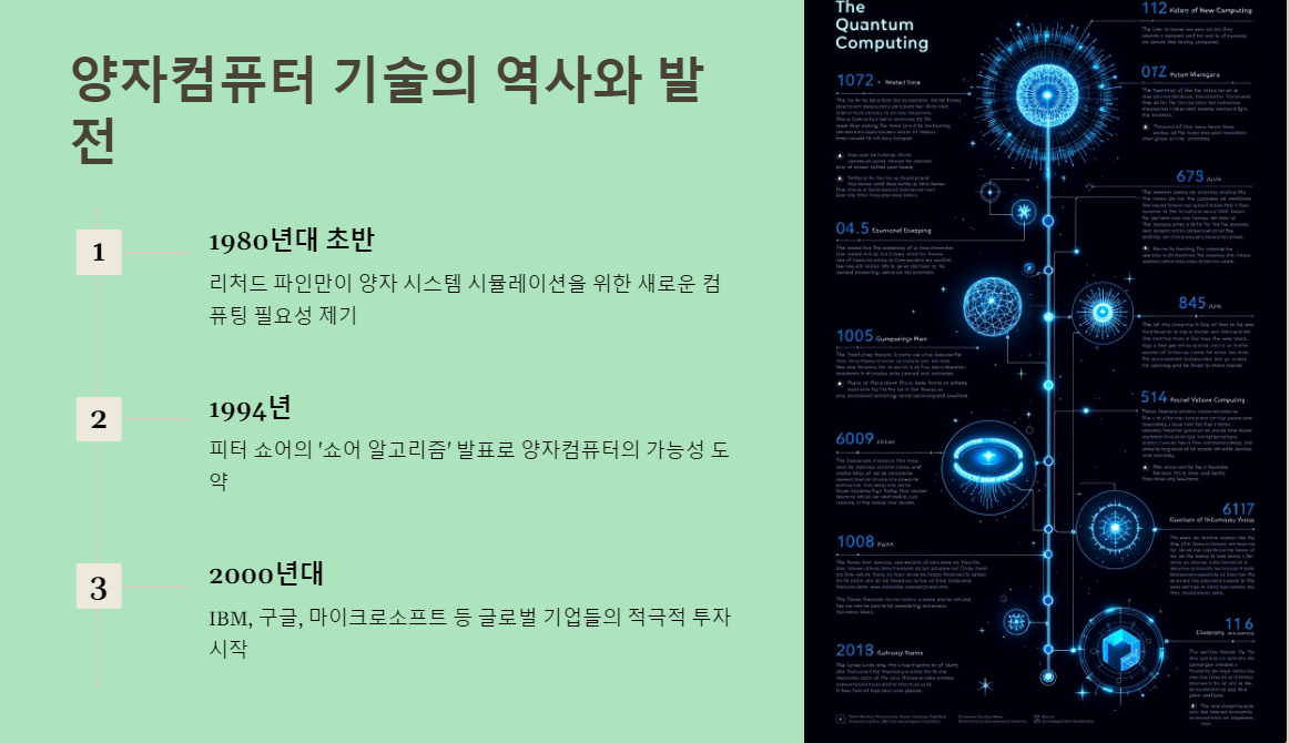 양자컴퓨터의 역사는 1980년대 초반으로 거슬러 올라가요. 이 당시 물리학자 리처드 파인만은 기존 컴퓨터가 양자 시스템을 제대로 시뮬레이션할 수 없다는 점을 지적하면서, 양자 역학의 원리를 이용한 새로운 형태의 컴퓨팅이 필요하다고 주장했어요. 이를 계기로 양자컴퓨터의 개념이 학계와 기술계에서 본격적으로 논의되기 시작했답니다.