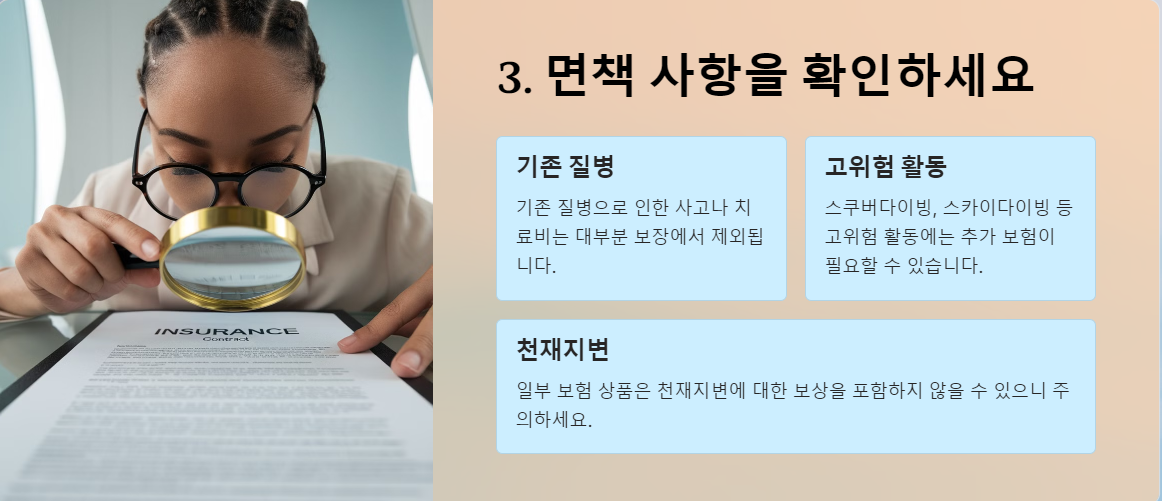 계약서의 작은 글씨로 쓰인 면책 조항까지 꼼꼼히 읽고, 필요한 경우 전문가의 조언을 구하는 것이 좋습니다. 모든 면책 사항을 숙지하고 이에 대비해 신중히 보험을 선택하세요.