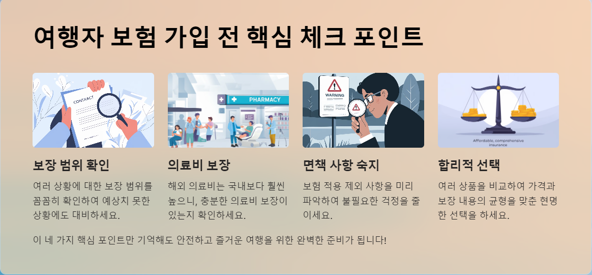여행자 보험은 여행 중 발생할 수 있는 다양한 위험으로부터 당신을 보호하기 위한 필수적인 준비물입니다. 하지만 보험 가입 시 몇 가지 중요한 요소를 놓치면 예상치 못한 상황에서 제대로 된 보상을 받지 못할 수 있습니다. 이 글에서는 여행자 보험을 선택하기 전 꼭 확인해야 할 다섯 가지 핵심 팁을 소개합니다.