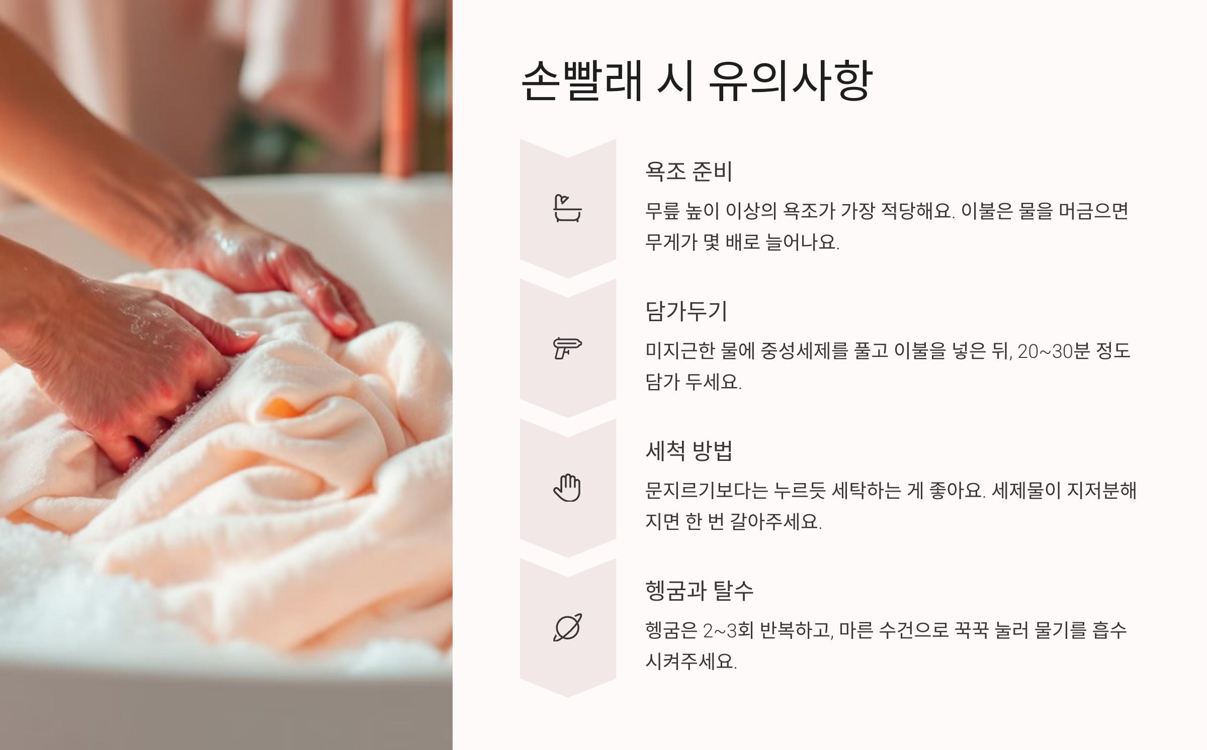 문지르기보다는 누르듯 세탁하는 게 좋고, 세제물이 너무 지저분해지면 한 번 갈아주는 게 좋아요. 헹굼은 최소 2~3회 반복해서 이불 안에 남은 세제가 완전히 빠지게 해주세요.