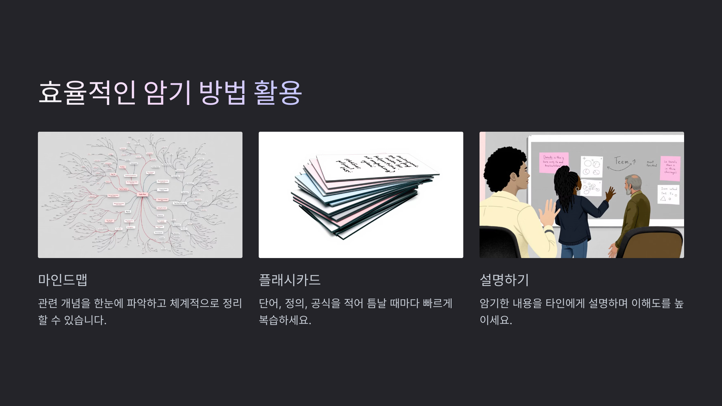 A3. 플래시카드, 마인드맵, 반복 학습 등 다양한 도구를 활용해 보세요. 시각적 자료와 함께 암기하면 효과가 더 좋아요.