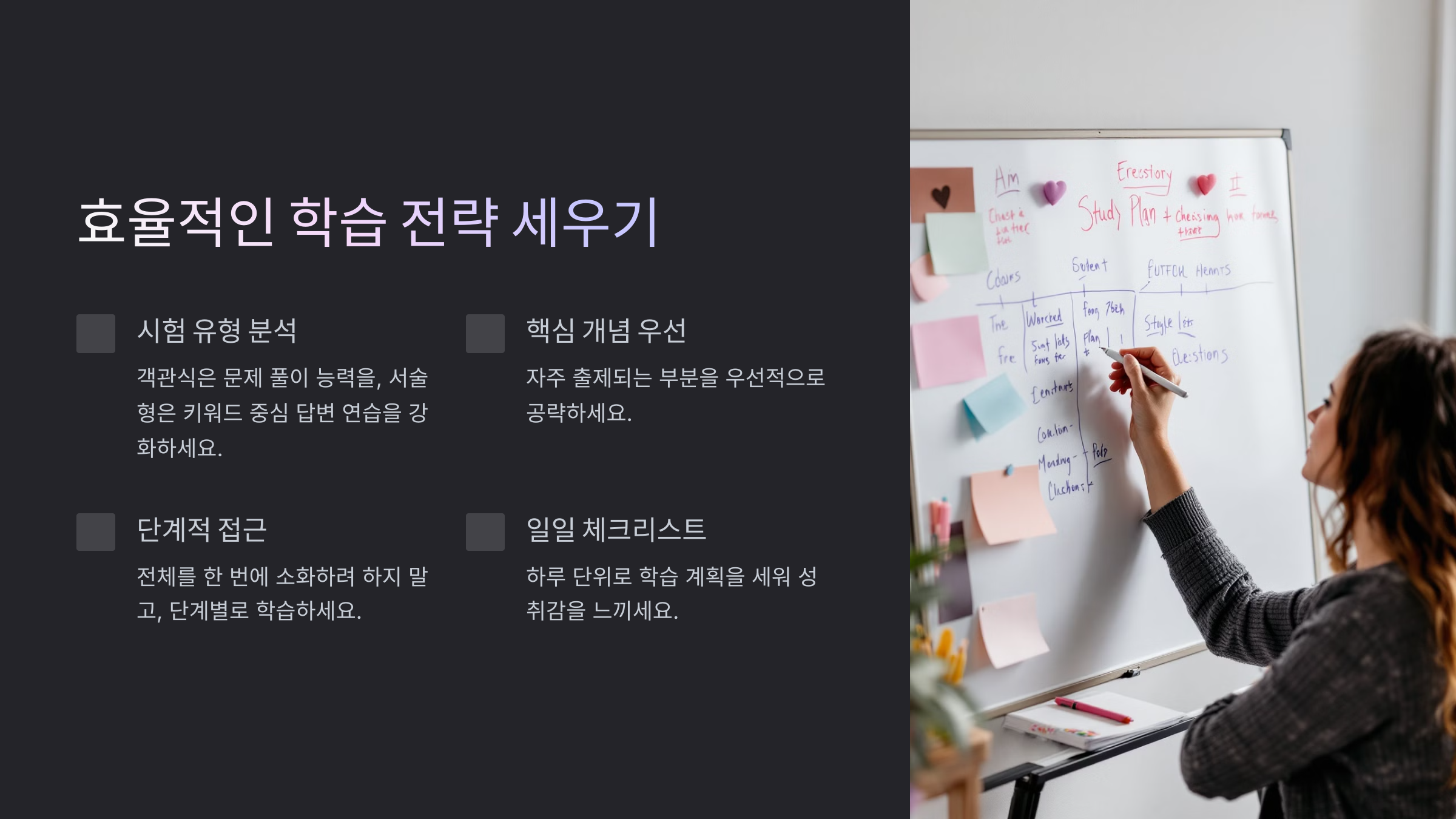 또한, 지나치게 완벽하게 하려고 하지 말고, 시험에 자주 나오는 부분부터 빠르게 학습하세요. 전체 내용을 한 번에 소화하려 하기보다 단계적으로 접근하는 것이 훨씬 효과적이에요.