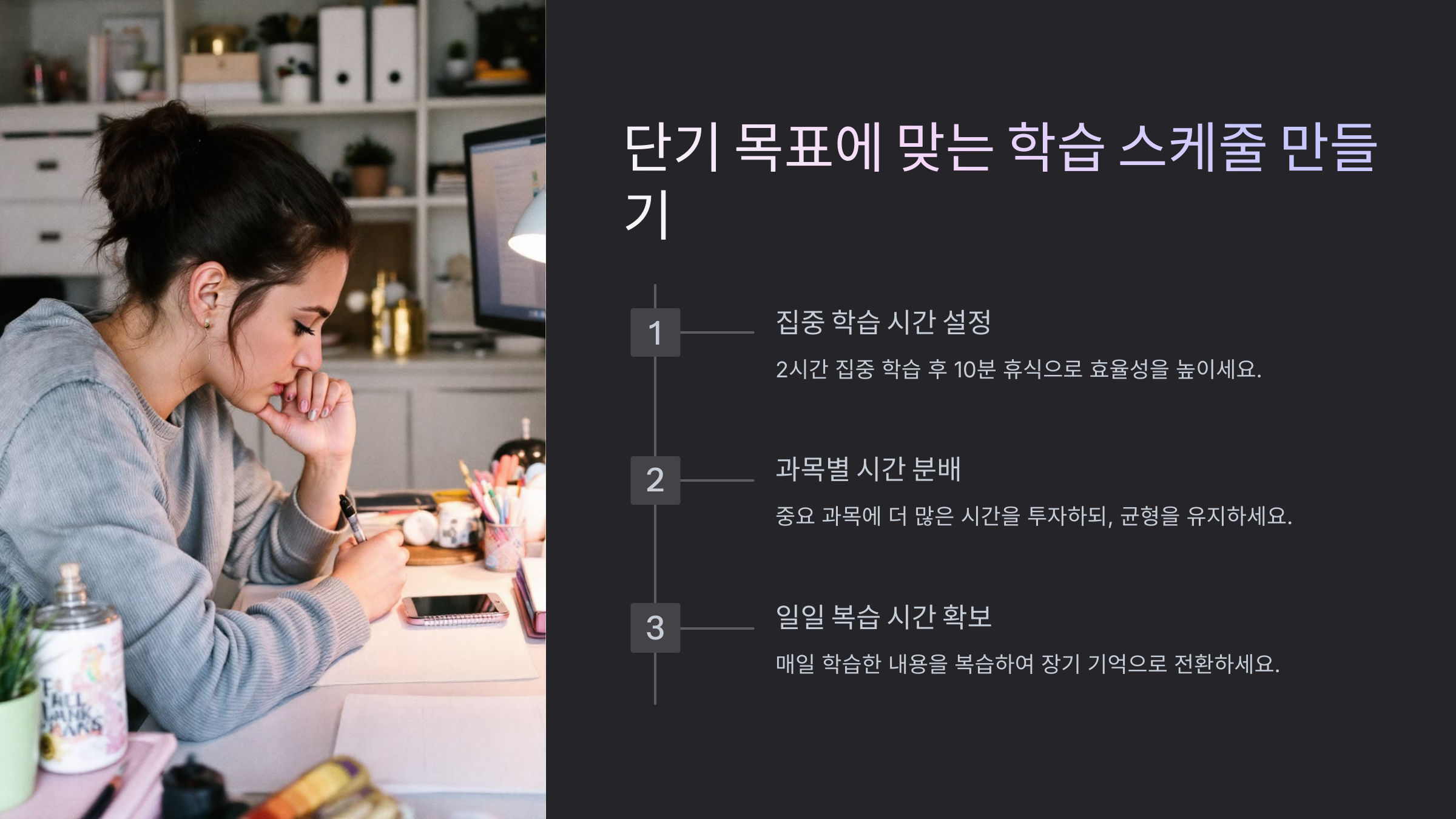 우선, 하루 학습 시간을 구체적으로 정하세요. 예를 들어, 2시간 집중 학습 후 10분 휴식하는 식으로 스케줄을 짜면 효과적이에요. 이 방법은 집중력을 유지하는 데 큰 도움이 돼요.