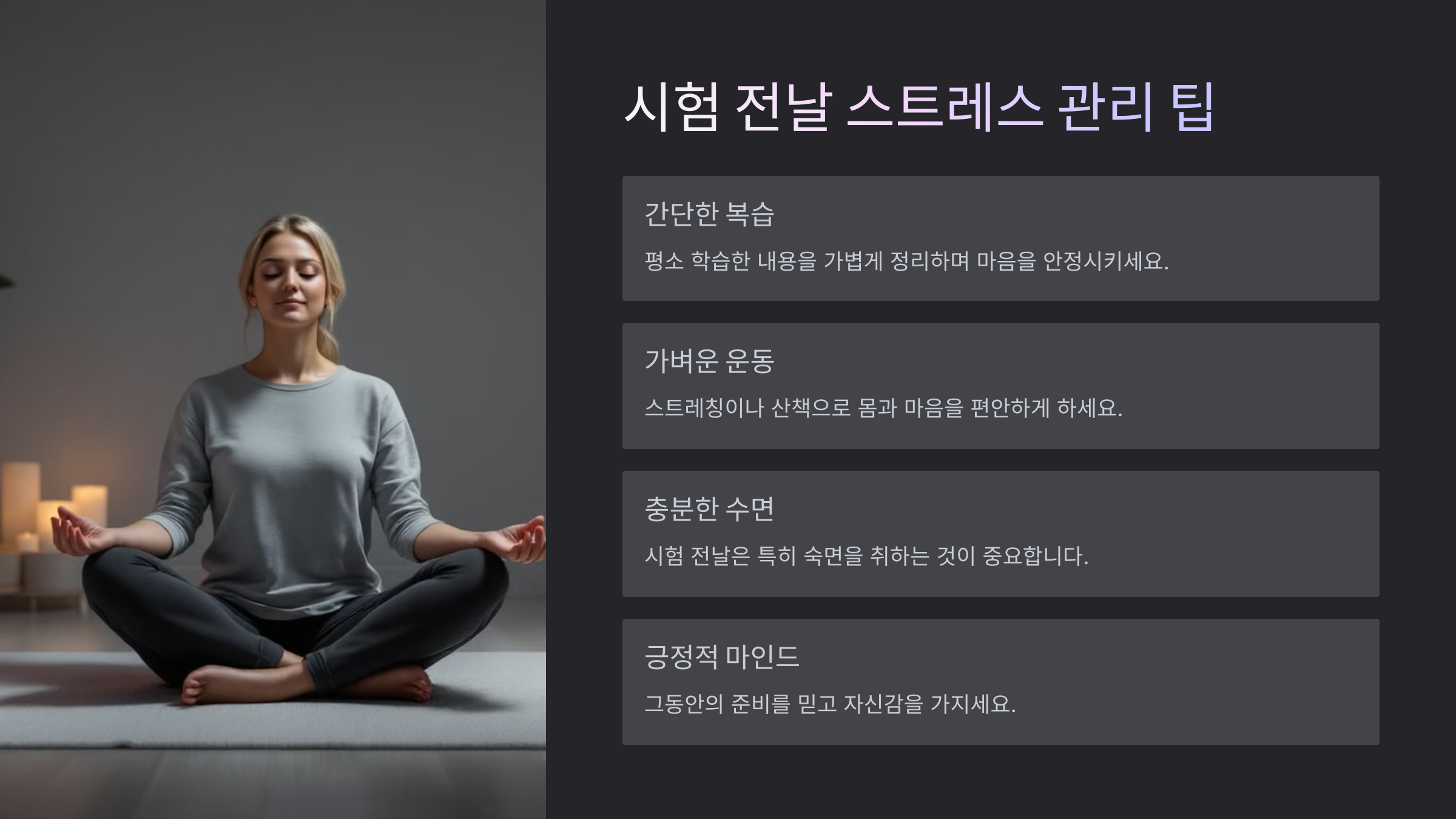 시험 당일 아침에는 가벼운 식사를 하고, 시험장에서 필요한 준비물을 미리 확인하세요. 시험 전날 계획을 잘 세우면 시험 당일에도 당황하지 않고 자신감 있게 임할 수 있어요.