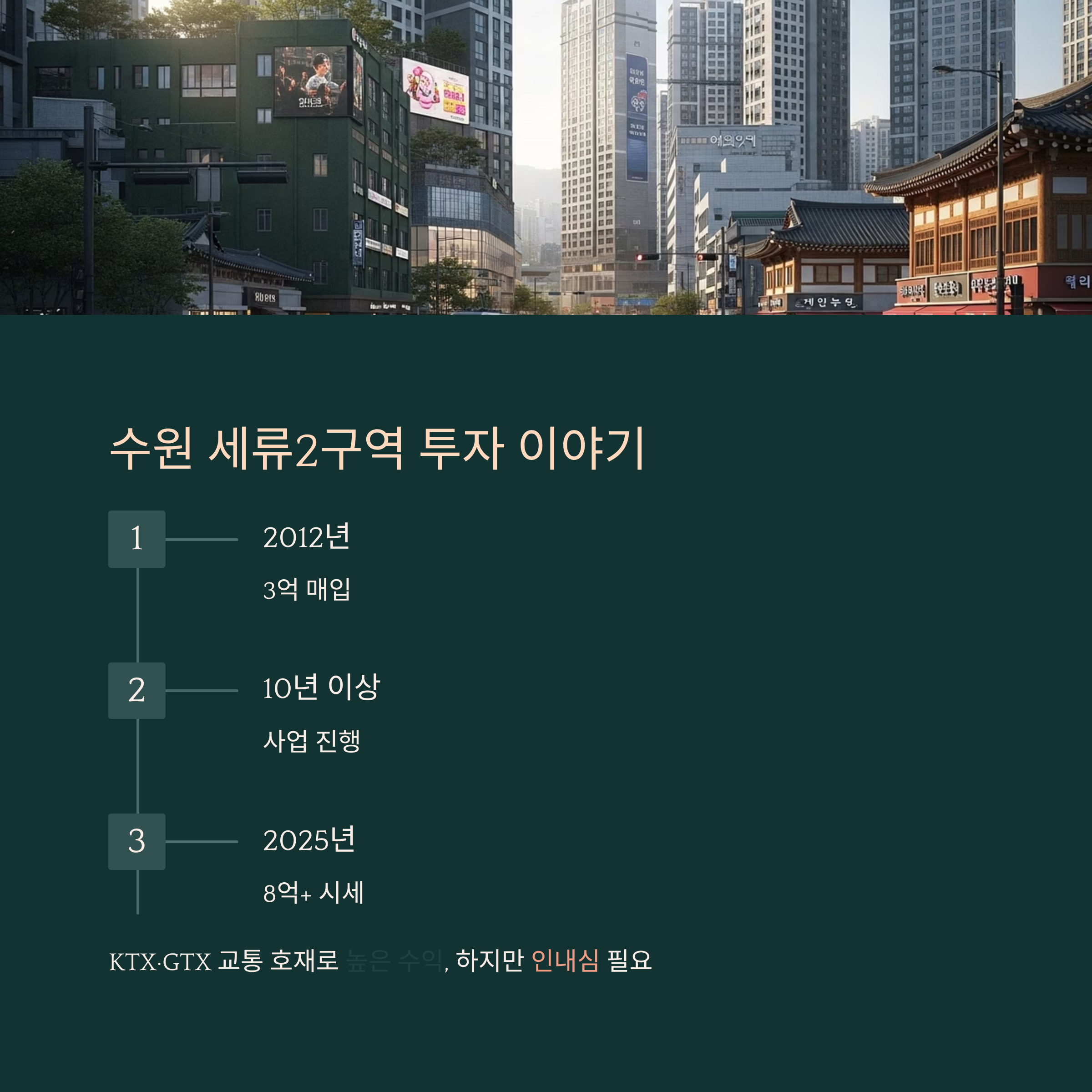 수익은 컸지만, 그만큼 인내심도 필요했던 곳이 수원 세류2예요. 투자자는 늘 리스크와 기회를 동시에 계산해야 한다는 교훈을 주는 구역이죠.