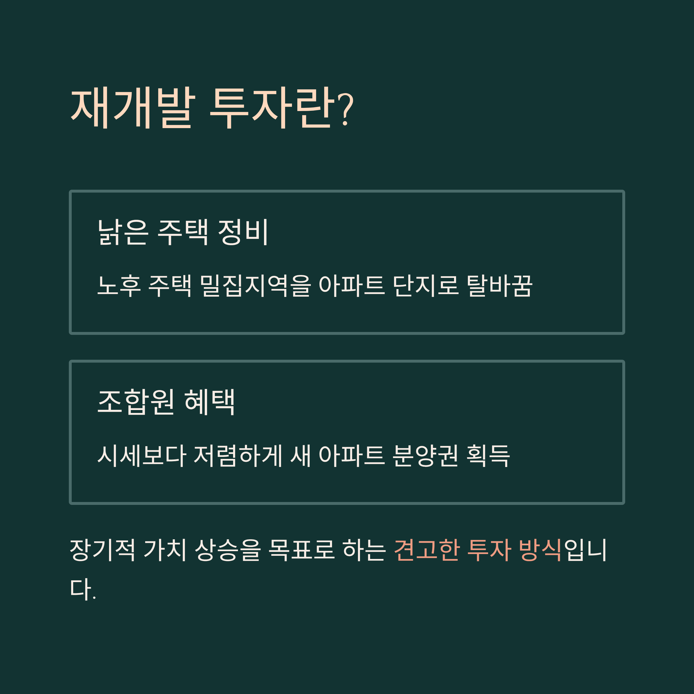 재개발 투자는 낡은 주택 밀집지역이나 기반시설이 부족한 구역을 새롭게 정비하면서 발생하는 권리를 통해 수익을 얻는 방식이에요. 대부분 오래된 단독주택이나 다세대 주택이 밀집한 곳에서 시작되며, 시간이 지나 아파트 단지로 탈바꿈하게 되죠.