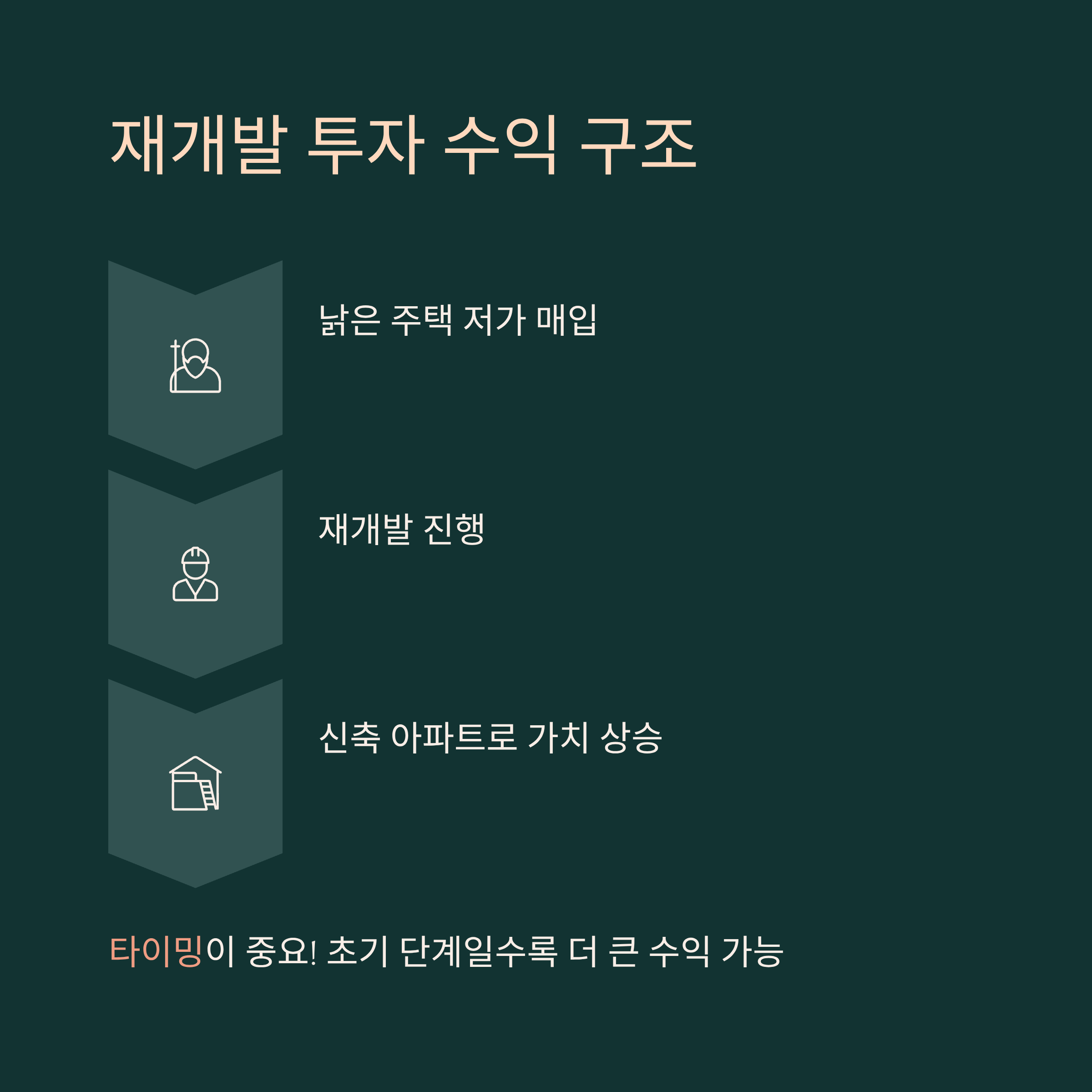 재개발에서 수익이 발생하는 구조는 아주 단순해요. 싼값에 낡은 주택을 매입한 뒤, 재개발 완료 후 신축 아파트로 바뀌면서 가치가 상승하는 것이죠. 이때 입주권이 생기고, 시세보다 낮은 가격으로 분양받아 추가적인 차익이 발생해요.